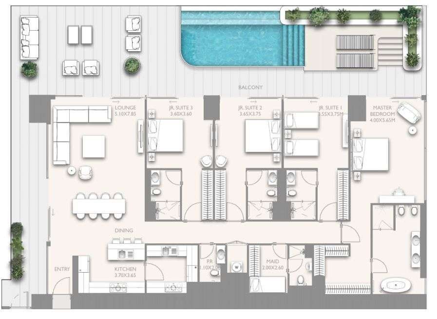 Willkommen in Ihrem zukünftigen Zuhause - einem 4-Schlafzimmer Penthouse, das Luxus auf höchstem Niveau bietet. Beim Betreten des Penthouses werden Sie von einem eleganten Massagezimmer empfangen, in dem Sie sich nach einem langen Arbeitstag