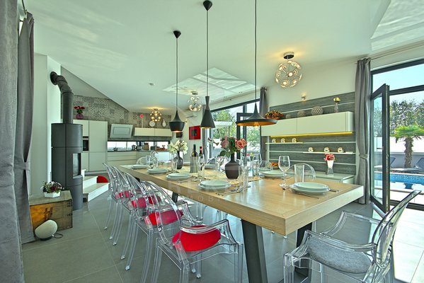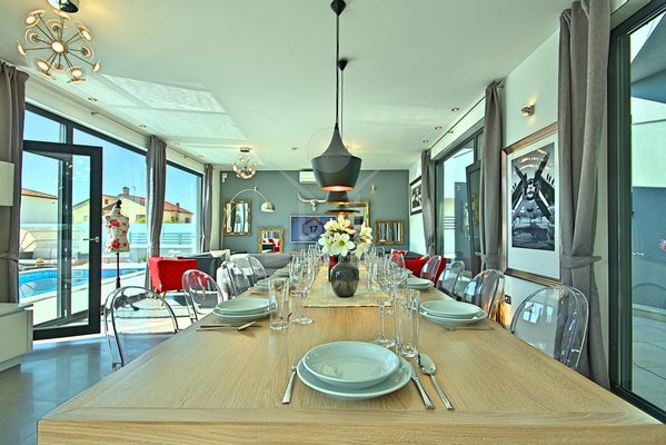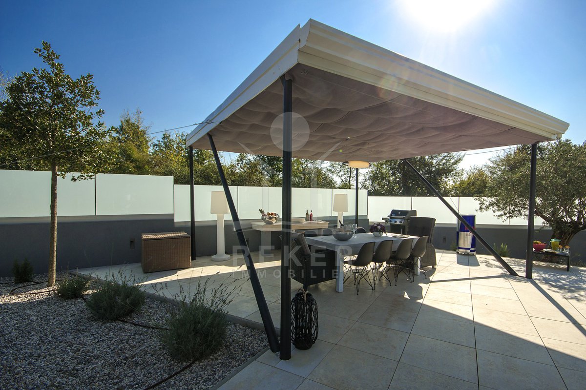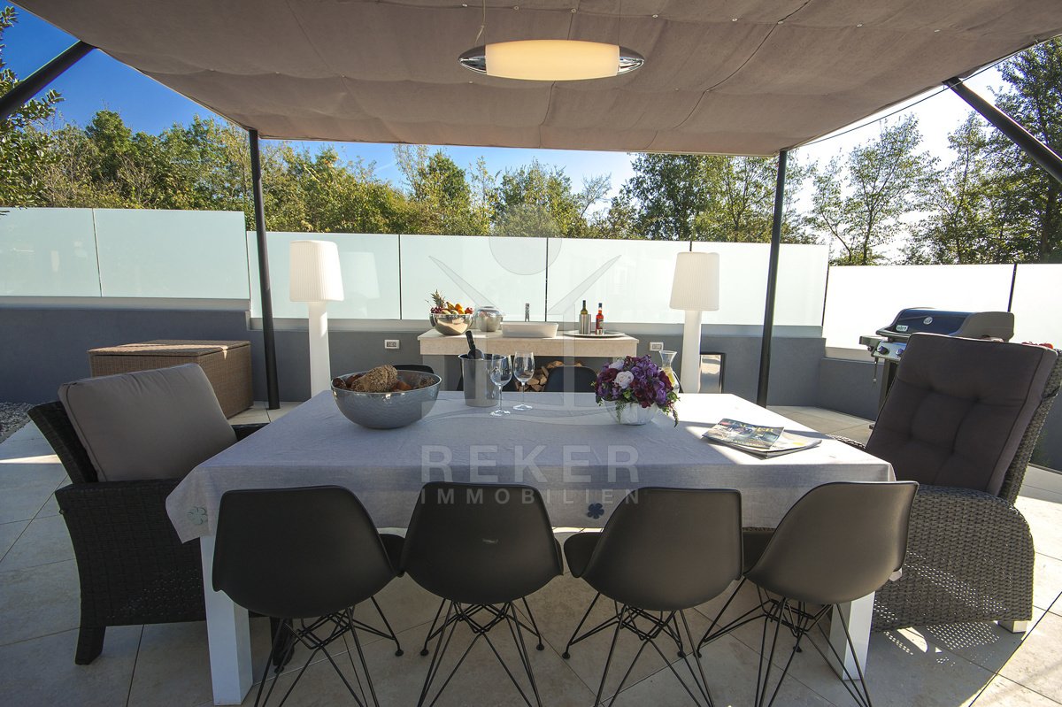 Herzlich willkommen in Ihrer Traumvilla in der Nähe von Poreč, wo modernes Design auf ein einladendes Familienleben trifft! Diese wunderschön möblierte und ausgestattete Villa begeistert mit einer herrlichen, überdachten Terrasse, die sich ideal für