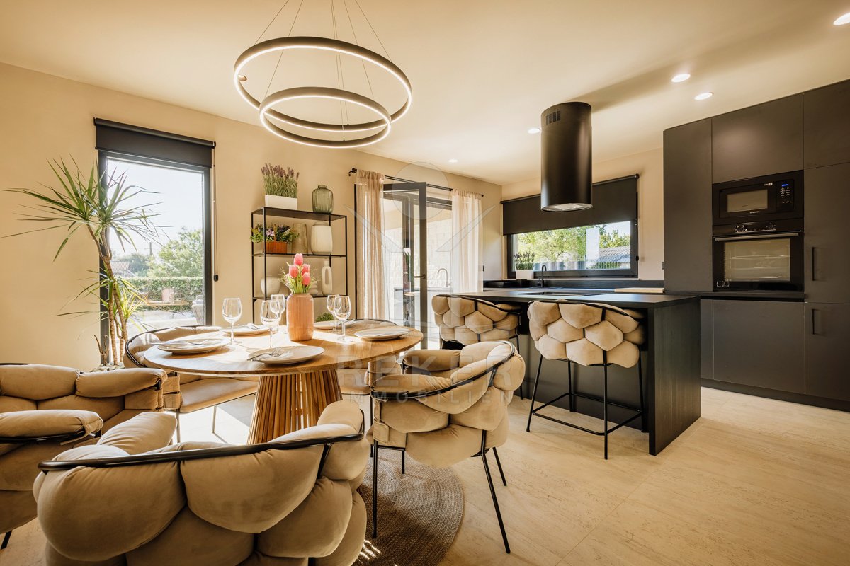 Der Außenbereich dieser Villa überzeugt auf ganzer Linie. Die großzügige Terrasse mit über 30 m² bietet reichlich Platz für Esstisch, Lounge-Möbel und Sonnenliegen – teils überdacht, mit Außenküche und direktem Zugang zum Garten. Der Pool schimmert im Sonnenlicht, eingerahmt von Natursteinplatten und einem gepflegten Rasen. Palmen, Oleander, ein Olivenbaum – mediterranes Urlaubsgefühl jeden Tag.