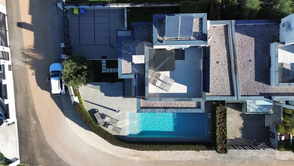 Die moderne Villa befindet sich in einer malerischen Lage eines charmanten Dorfes, umgeben von idyllischer ländlicher Schönheit und üppigem Grün. Der wunderschöne Strand ist nur 500 Meter entfernt, sodass Sie jederzeit einen erfrischenden Tag am Meer