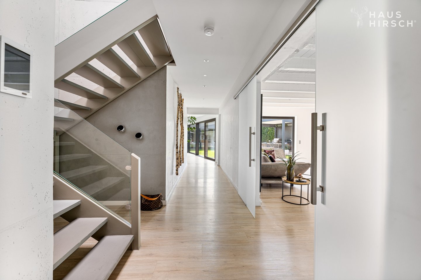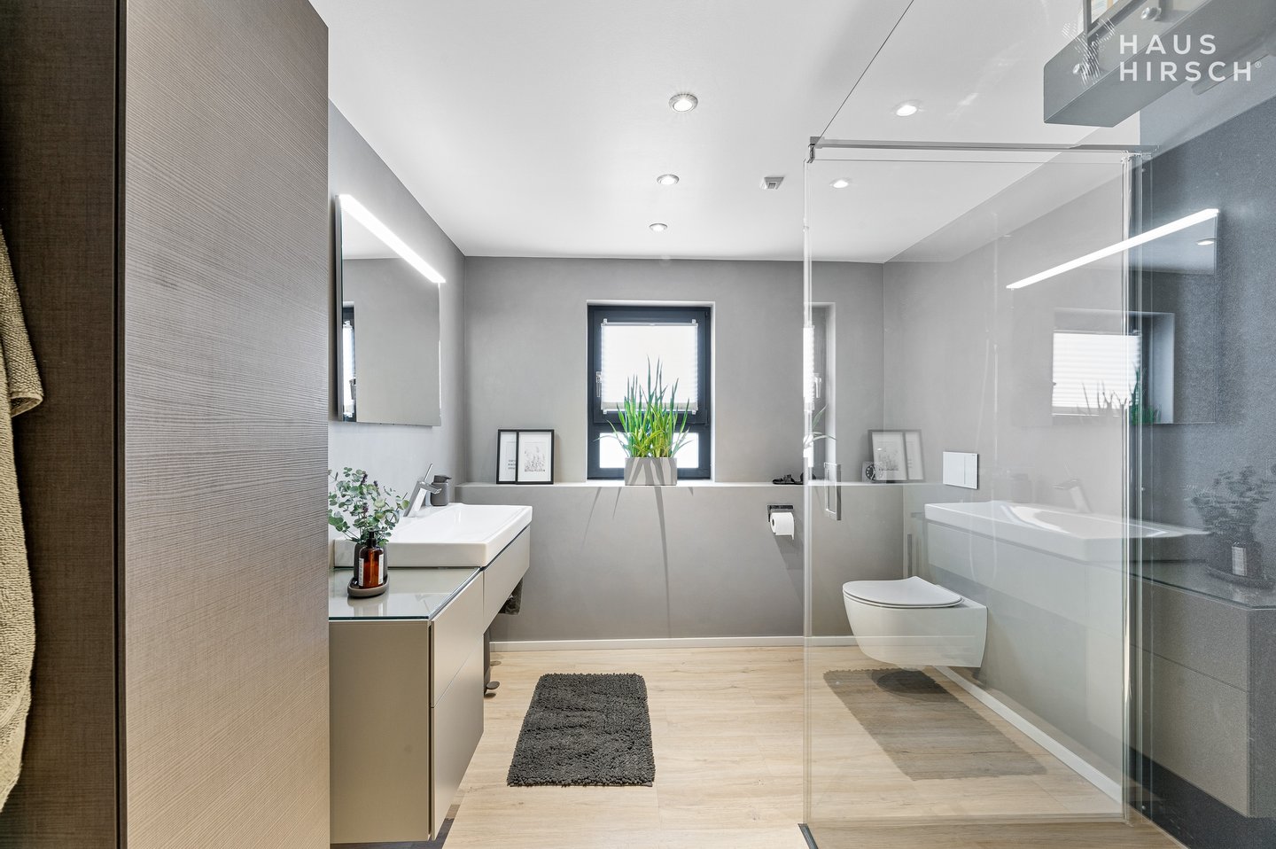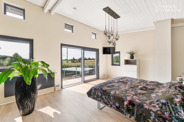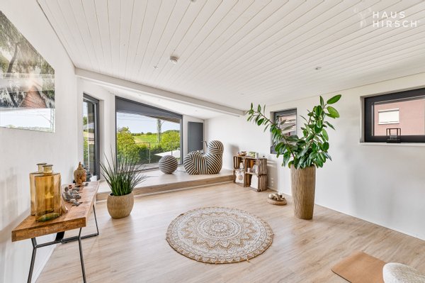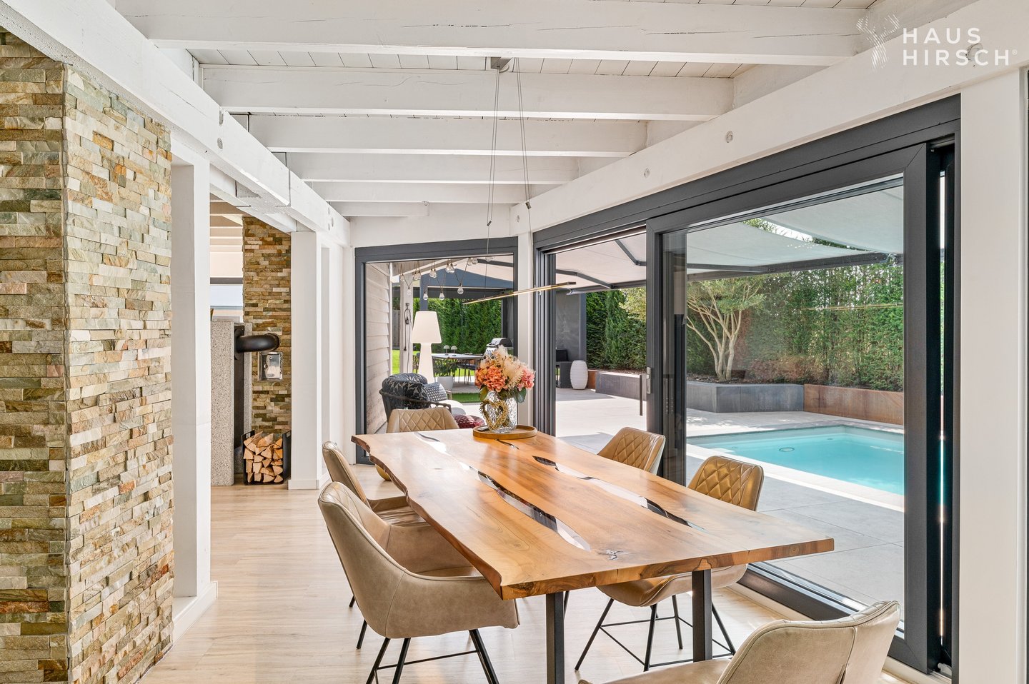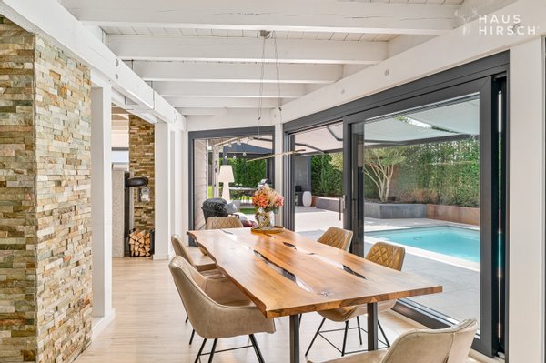 Genießen Sie die Komfortausstattung des Anwesens, wie die automatische Regulierung der Heizungsanlage, die Steuerung über die Gira-App, die hochwertigen ZIP-Screens, die Panoramafenster im Neubau und die durchdachte Beleuchtung im gesamten Außenbereich.