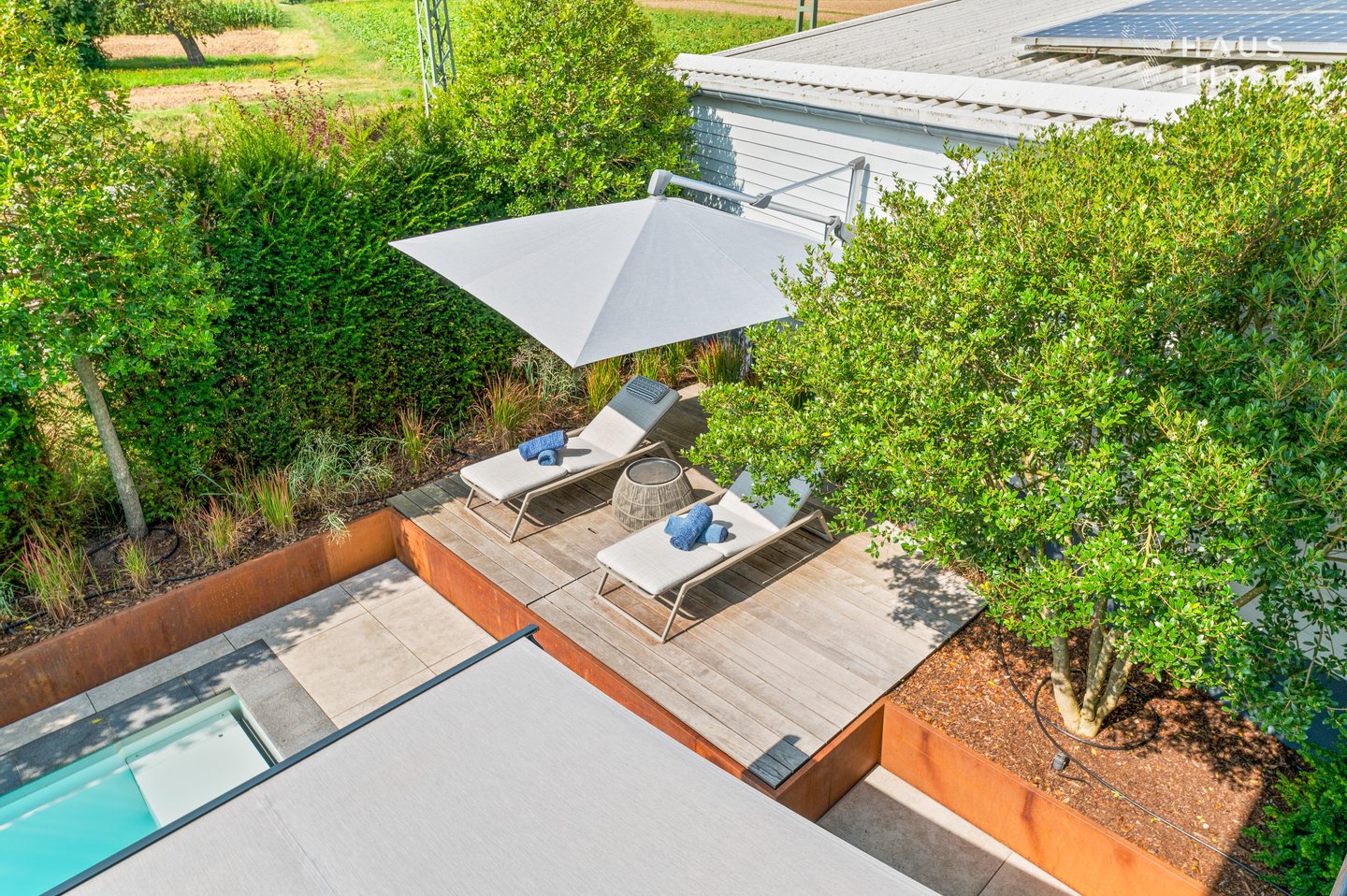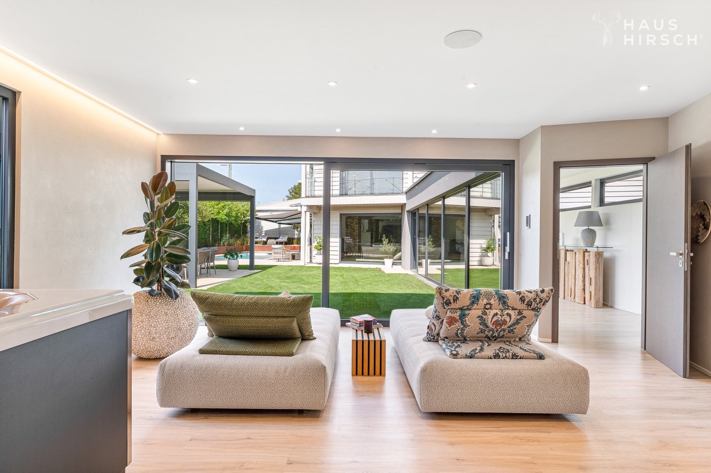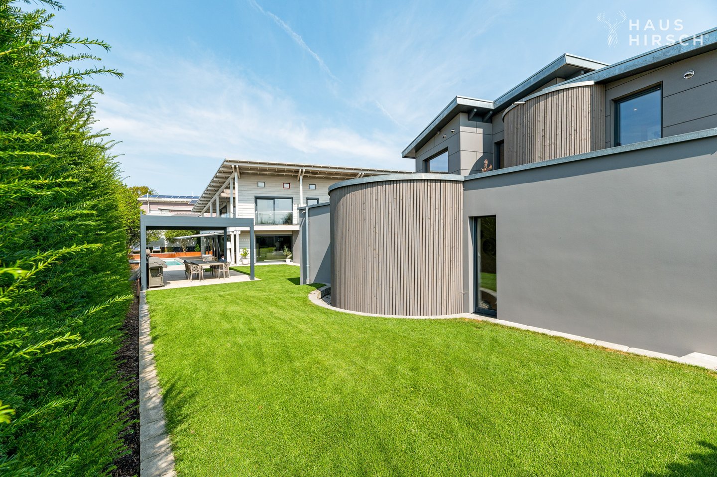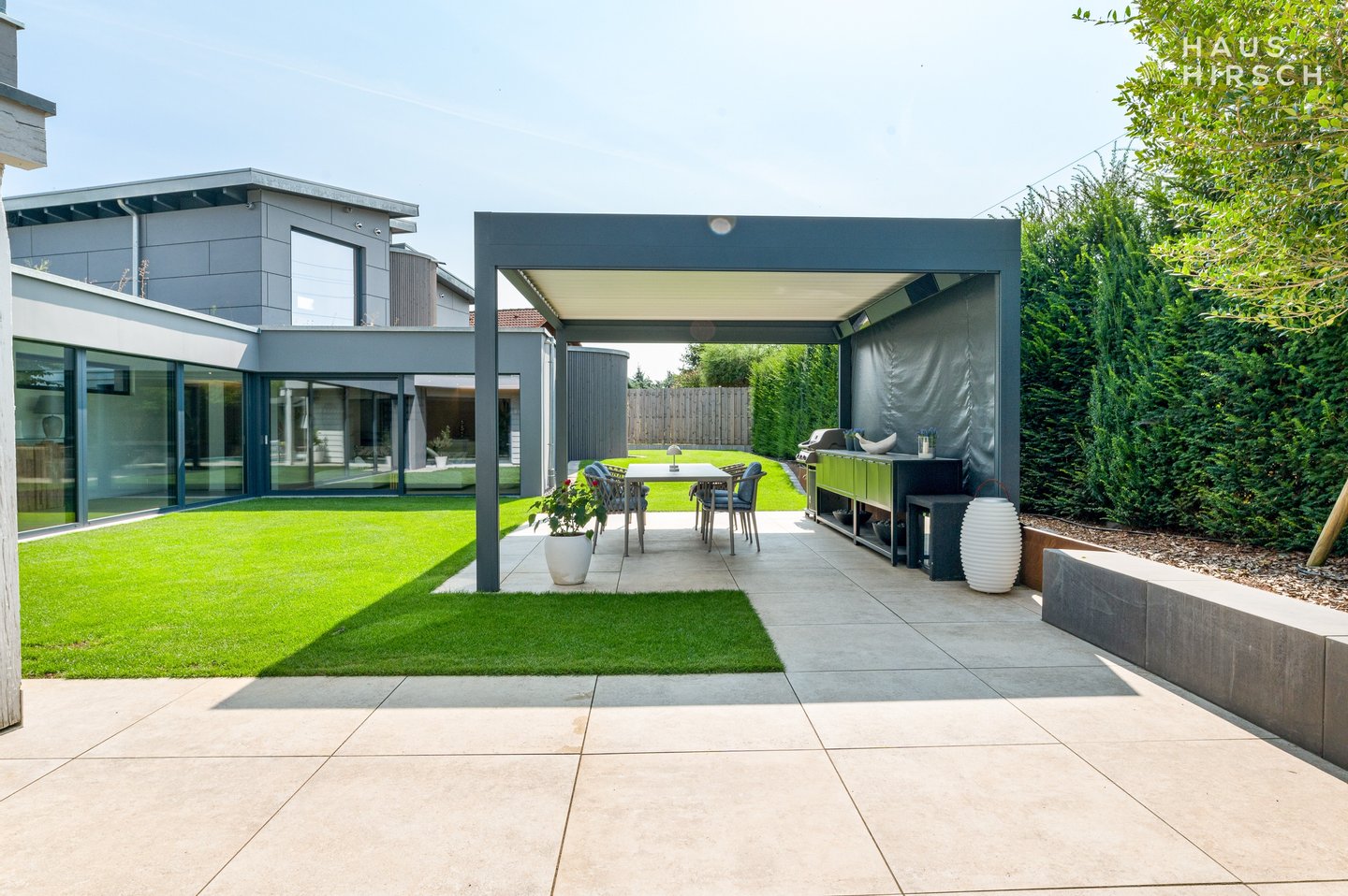Der Außenbereich lädt zum Verweilen ein: Die hochwertige Pergola mit integriertem Grill, verstellbarem Dach und Bose Musikanlage lässt keine Wünsche offen. Der beheizbare Aussenpool mit Maßen von 3,5x9m und einem Solarrolladen verfügt über eine automatisierte Chlor- und pH-Wert Mess- und Filteranlage. Bodenbeleuchtung im Garten, steuerbar über die Gira-App, sowie Baum- und Fassadenbeleuchtung schaffen eine einzigartige Atmosphäre. Bäume und Rasen werden über Zisternen bewässert und ein Rasenroboter sorgt für eine optimale Rasenhöhe.