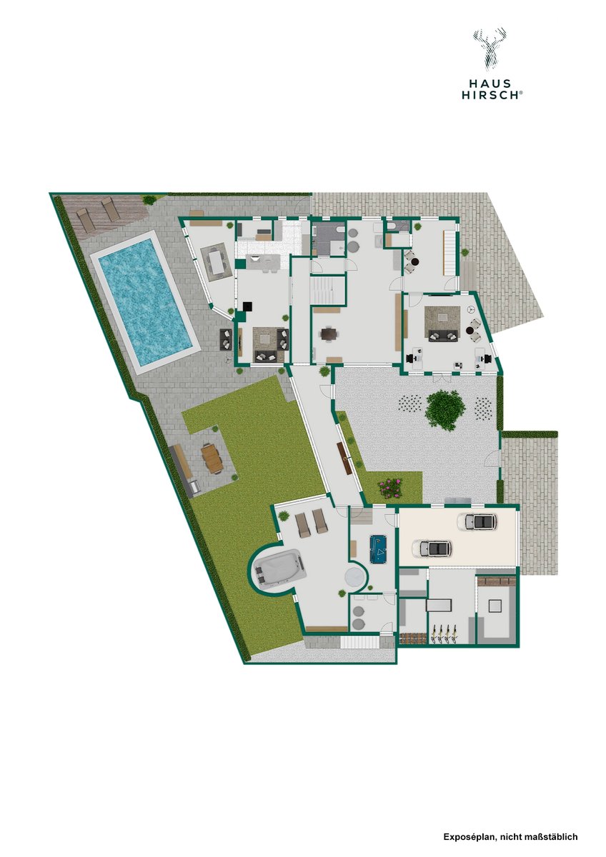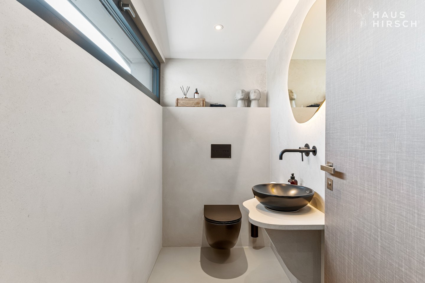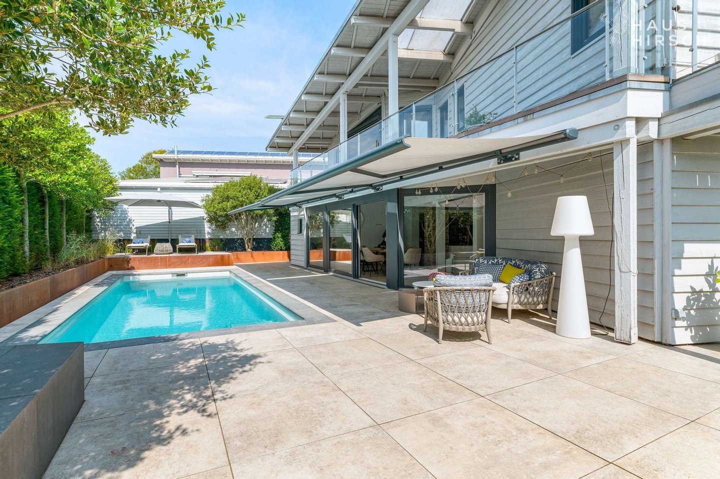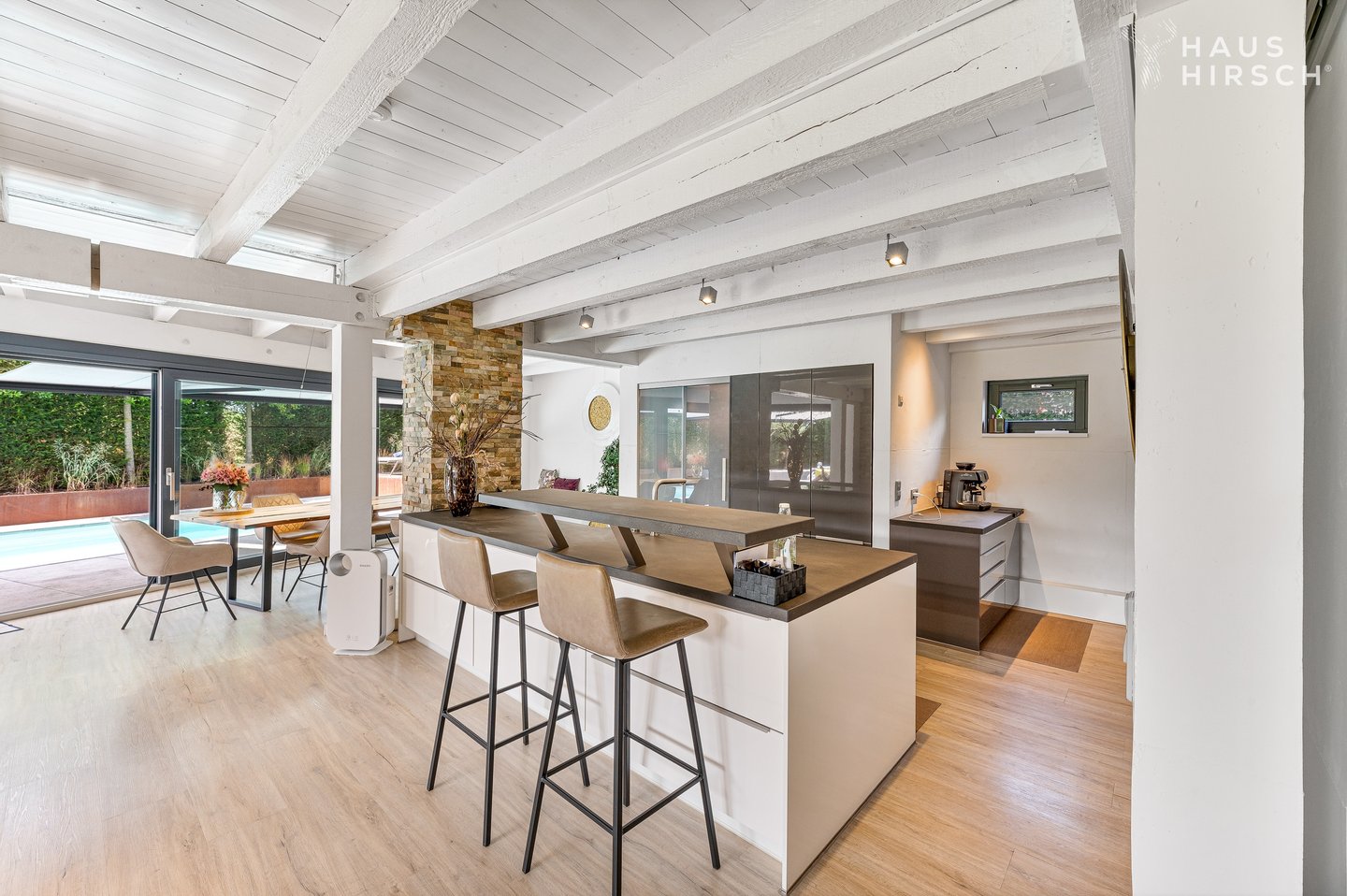 Der Außenbereich lädt zum Verweilen ein: Die hochwertige Pergola mit integriertem Grill, verstellbarem Dach und Bose Musikanlage lässt keine Wünsche offen. Der beheizbare Aussenpool mit Maßen von 3,5x9m und einem Solarrolladen verfügt über eine automatisierte Chlor- und pH-Wert Mess- und Filteranlage. Bodenbeleuchtung im Garten, steuerbar über die Gira-App, sowie Baum- und Fassadenbeleuchtung schaffen eine einzigartige Atmosphäre. Bäume und Rasen werden über Zisternen bewässert und ein Rasenroboter sorgt für eine optimale Rasenhöhe.