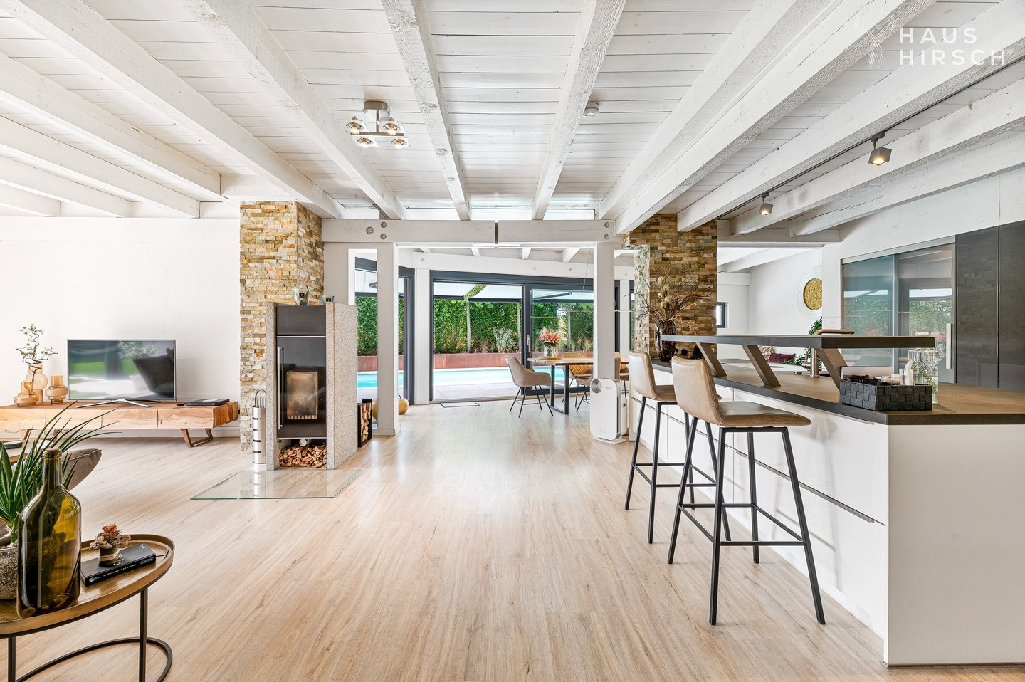 Die Kombination aus Wohn- und Geschäftsräumen ermöglicht es Familien und Unternehmern, ihre Bedürfnisse unter einem Dach zu vereinen. Die offene Küche, der großzügige Wohn- und Essbereich mit Kamin, sowie die Glas- und Schiebetüren, die den direkten Zugang zum Garten ermöglichen, schaffen eine einladende Atmosphäre.