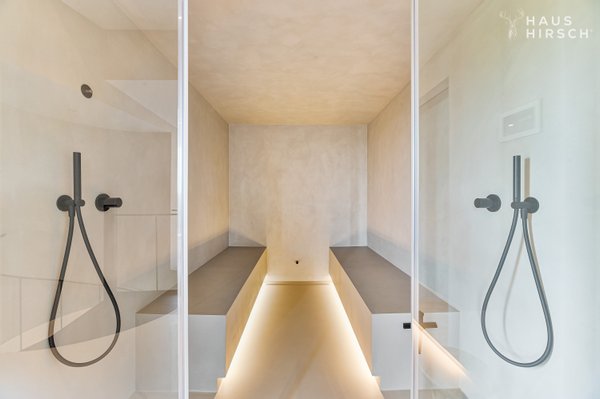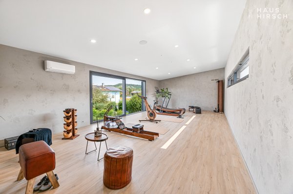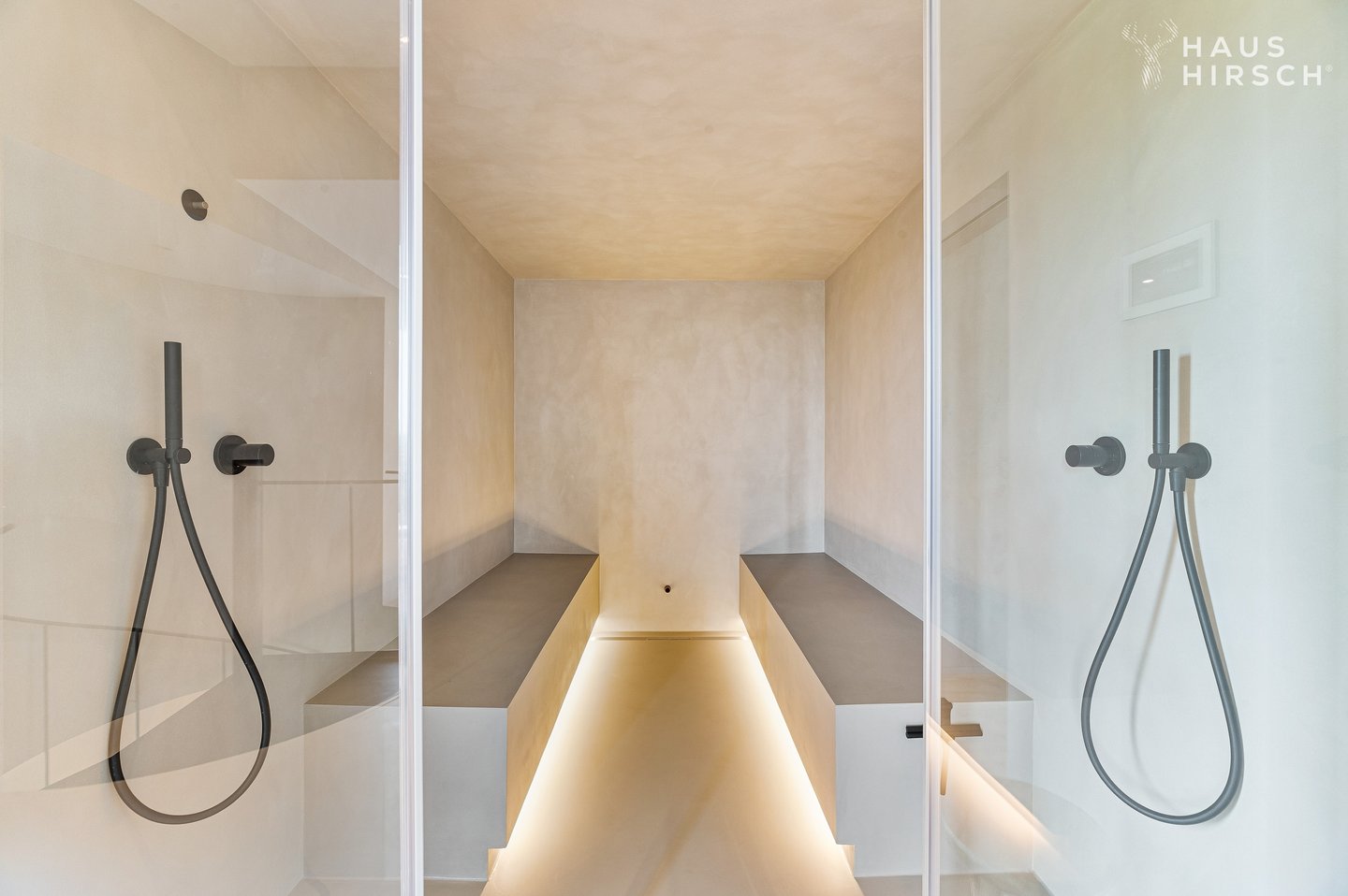 Der Neubau beeindruckt mit einem Wellnessbereich von ca. 180 Quadratmetern, der keine Wünsche offen lässt. Entspannen Sie in einem Gesundheits-Whirlpool der Marke Whirlcare, genießen Sie die Sauna mit Bluetooth-Musikeinstellung oder relaxen Sie im Dampfbad nebenan. Ein Ruheraum mit Sono Lautsprechern und eine Regendusche sorgen für ultimative Entspannung. Der Fitnessraum ist mit einem steuerbaren ZIP-Screen, Sono Lautsprechern und einer Klimaanlage ausgestattet. Dieser Raum kann auch flexibel als Schulungsraum genutzt werden. Fugenlose Wände und Böden verleihen dem Wellnessbereich eine moderne und luxuriöse Atmosphäre.