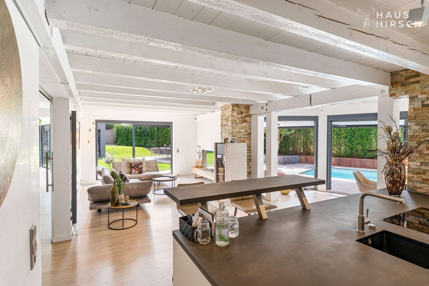 Der Wellnessbereich, ausgestattet mit einem Whirlpool, Sauna und Dampfbad, sowie der beheizbare Außenpool mit einer hochwertigen Pergola, bieten zudem einen Rückzugsort für Entspannung und Erholung nach einem langen Arbeitstag. Durch die moderne Bauweise und die hochwertigen Materialien entsteht eine ansprechende und luxuriöse Atmosphäre, die sowohl für das Wohnen als auch für die Arbeit geeignet ist.