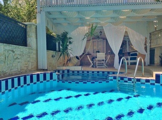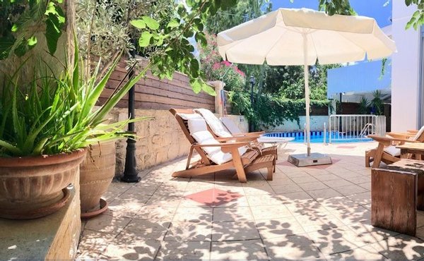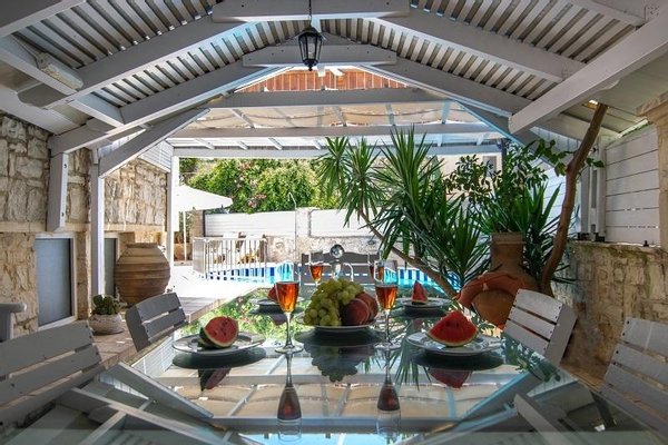Die Außenbereiche der Villa sind ebenso beeindruckend. Sie gruppieren sich um einen atemberaubenden privaten Swimmingpool mit wunderschönen Mosaikfliesen, der von üppigem Grün und traditionellen Steinmauern für zusätzliche Privatsphäre eingerahmt wird. Eine schattige Pergola mit fließenden weißen Vorhängen schafft eine traumhafte Kulisse für Mahlzeiten im Freien, während die sonnendurchflutete Terrasse mit bequemen Liegestühlen und einem großen Sonnenschirm perfekt ist, um die mediterrane Atmosphäre zu genießen.