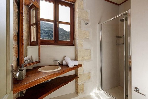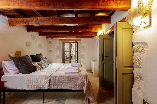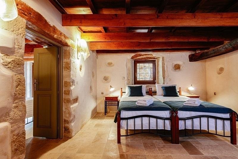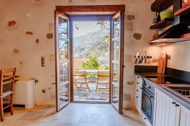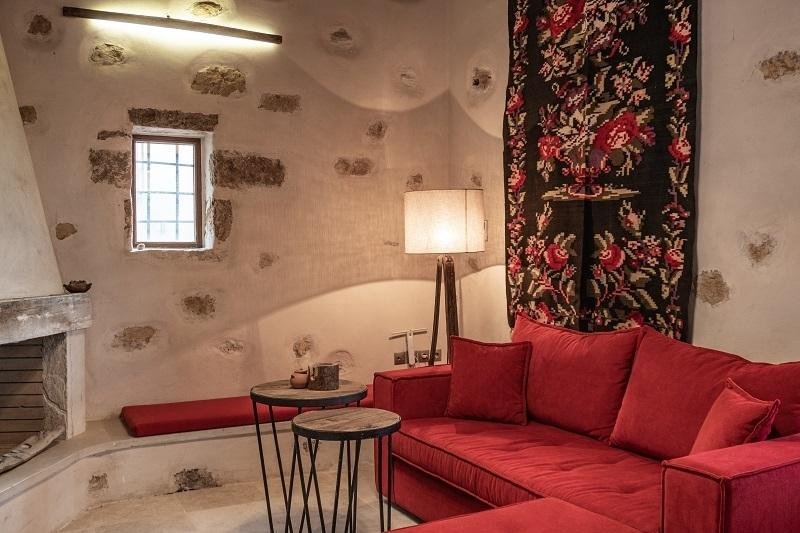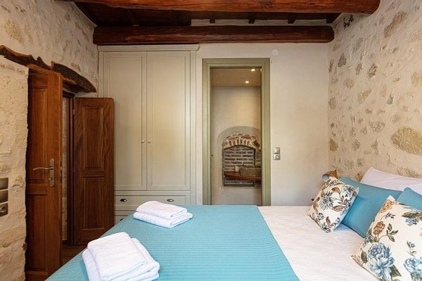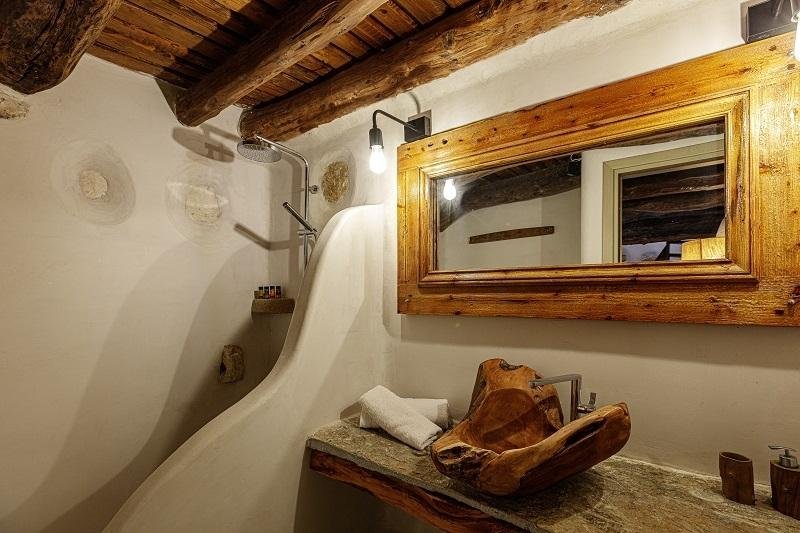 Das Interieur der Villa besticht durch rustikale Eleganz mit freiliegenden Steinwänden, Holzdecken und geschmackvoll ausgewählten Möbeln, die Wärme und Charakter ausstrahlen. Die Wohnbereiche sind komfortabel und stilvoll gestaltet und verfügen über gemütliche Sitzgelegenheiten, traditionell gewebte Wandteppiche und stimmungsvolle Beleuchtung, die eine einladende Atmosphäre schaffen. Die voll ausgestattete Küche besticht durch ihren rustikalen Charme und ist mit modernen Geräten ausgestattet. Der direkte Zugang zur Außenterrasse lädt zum Essen im Freien ein.