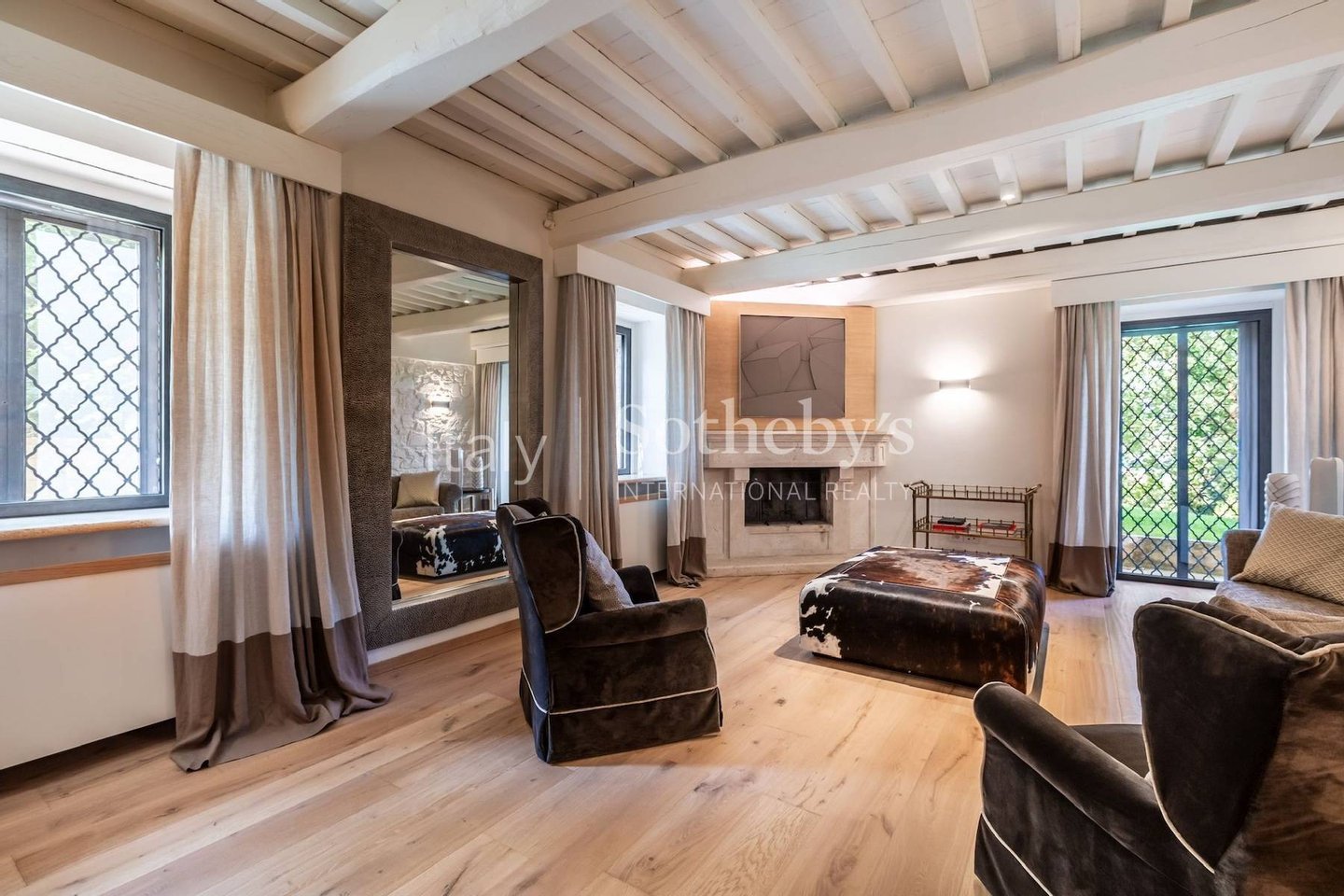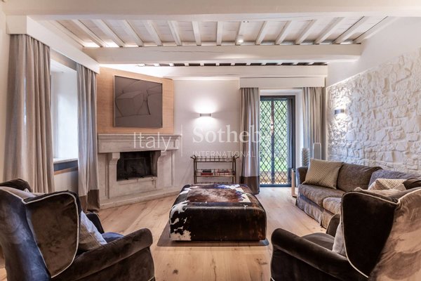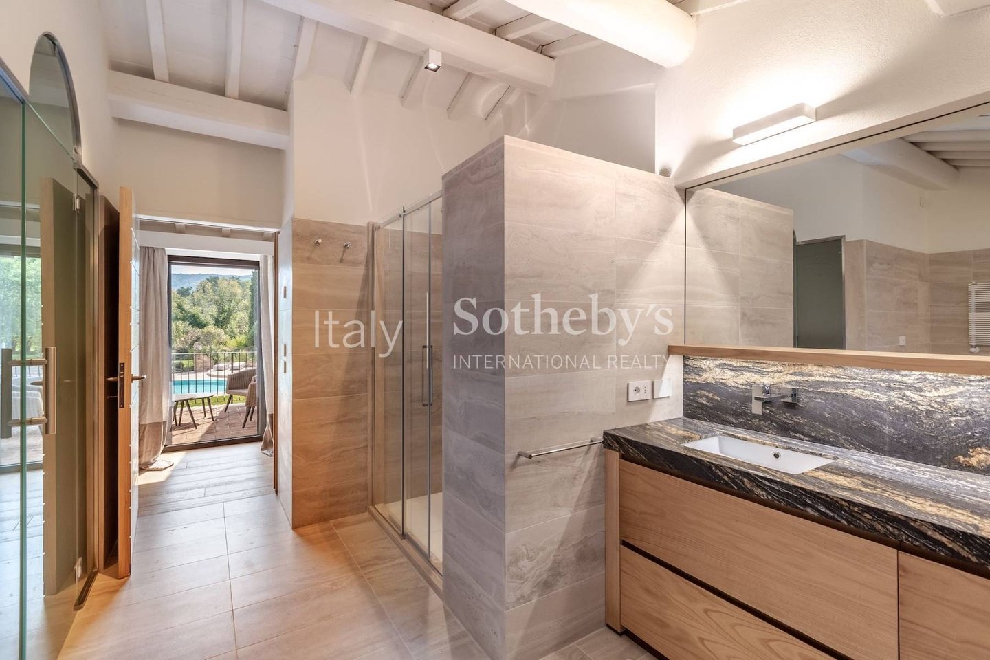 Schon die von majestätischen Zypressen gesäumte Zufahrt vermittelt die Eleganz und Atmosphäre, die diese Immobilie auszeichnen. Die Innenräume, veredelt mit edlem Eichenparkett und weiß gekalkten Balken, sind lichtdurchflutet. Im Erdgeschoss befinden sich zwei Wohnzimmer - beide mit Kamin -, ein Schlafzimmer mit Bad en suite sowie ein Essbereich mit vom Architekten des Projekts entworfenen Stühlen. Die Küche ist mit hochwertigen Geräten ausgestattet, darunter ein Fiaba-Kühlschrank und ein Gaggenau-Backofen. Ergänzt wird sie durch ein Gäste-WC, eine Waschküche und einen Bereich für das Personal, von dem aus man den ideal als Weinkeller nutzbaren Keller erreicht. Ein komfortabler Lastenaufzug führt in das Obergeschoss, wo sich die Master-Suite mit Terrasse, Kamin, Bad mit Dusche und Badewanne sowie ein aktuell als Jugendzimmer genutztes Wohnzimmer befindet. Abgerundet wird diese Etage durch drei weitere Schlafzimmer und zwei Badezimmer.