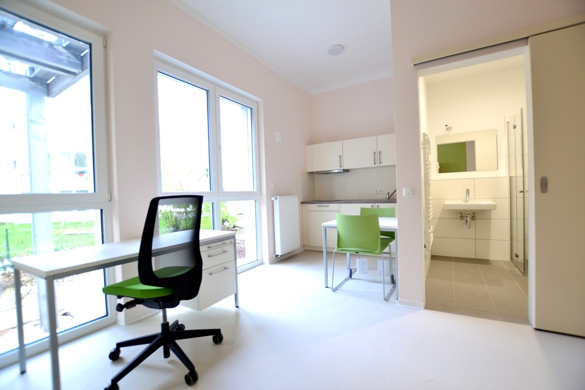 Die 20 qm - 25 qm großen 1-Zimmer-Apartment sind komplett möbliert und mit einer vollwertigen Küchenzeile, Schreibtisch mit Bürostuhl, Tisch mit zwei Stühlen, Kleiderschrank, Regal und Schlafsofa (ausziehbar) ausgestattet.