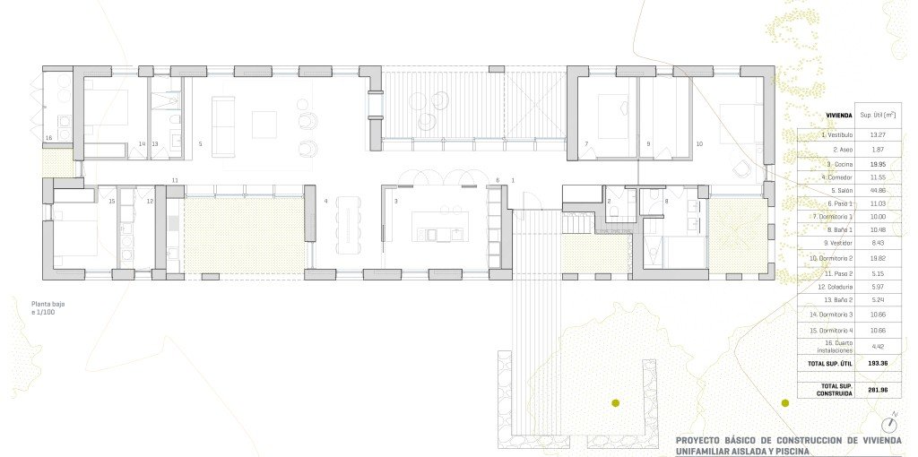 Ein Projekt für ein einstöckiges, modernes Haus mit einer Fläche von 280 m², vier Schlafzimmern, Innenhöfen und einem Swimmingpool wurde von einem örtlichen Unternehmen mit Erfahrung in der Regulierung von Land im ländlichen Raum entworfen.