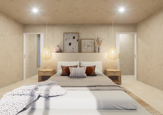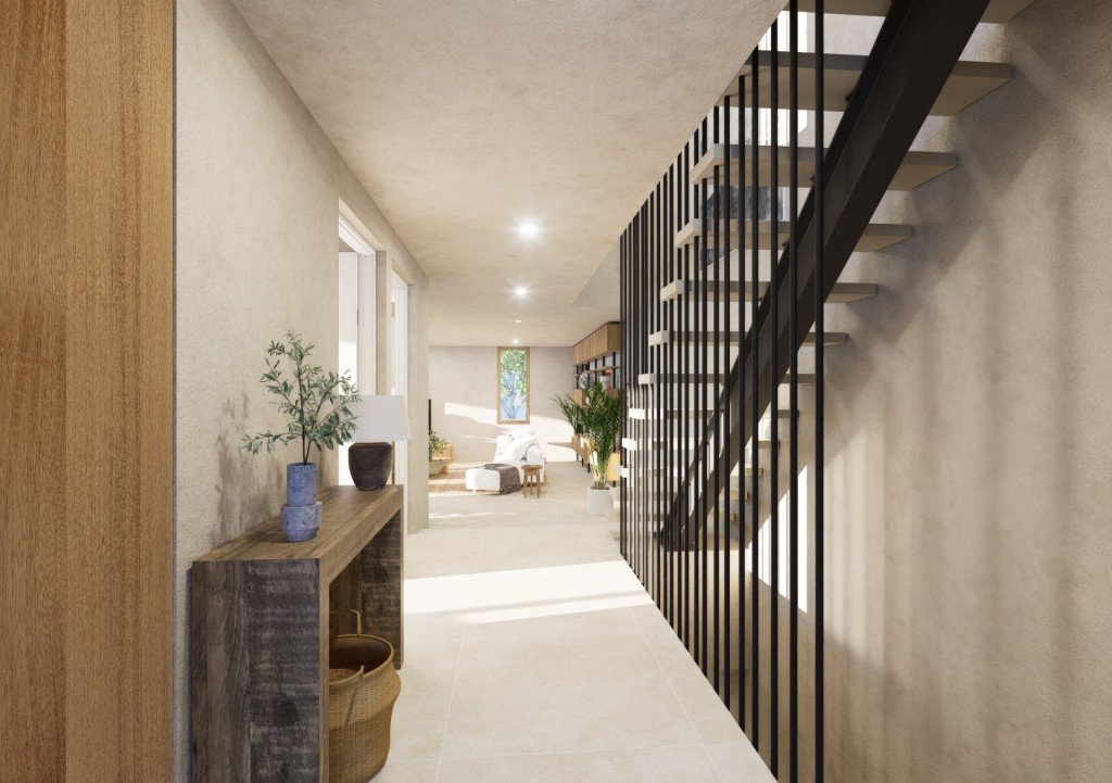 Das Design für die obere Ebene umfasst drei Doppelzimmer, jedes mit eigenem Bad. Zwei dieser Schlafzimmer haben direkten Zugang zu einer großen Terrasse mit Balkon, von der aus man einen wunderschönen Blick auf das Meer, die Berge, den Pool und den Garten hat.