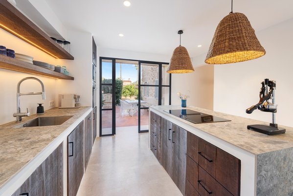 Die Räume verteilen sich auf zwei Etagen. Beim Betreten der Villa gelangen Sie in einen Essbereich, der durch einen schönen Torbogen vom gemütlichen Wohnzimmer getrennt ist. Der Essbereich wird durch eine geschmackvoll gestaltete Küche mit Kochinsel und integrierten Geräten ergänzt, die zur hinteren Terrasse mit Springbrunnen und Essbereich im Freien führt.