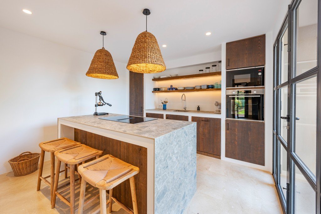 Die Räume verteilen sich auf zwei Etagen. Beim Betreten der Villa gelangen Sie in einen Essbereich, der durch einen schönen Torbogen vom gemütlichen Wohnzimmer getrennt ist. Der Essbereich wird durch eine geschmackvoll gestaltete Küche mit Kochinsel und integrierten Geräten ergänzt, die zur hinteren Terrasse mit Springbrunnen und Essbereich im Freien führt.