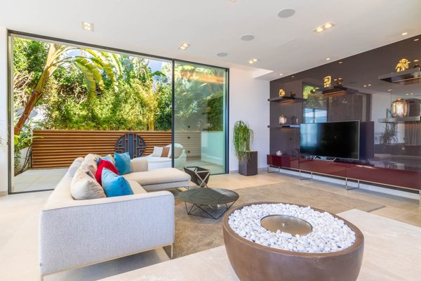 Der Hauptwohnbereich mit Poolterrasse befindet sich auf der oberen Ebene. Dieser weitläufige offene Wohn- und Essbereich ist mit großen Schiebefenstern ausgestattet, die vom Boden bis zur Decke reichen und sich an drei Seiten öffnen lassen, und es gibt eine hochwertige Einbauküche. Neben der Poolterrasse befindet sich ein Essbereich sowie ein charmanter Innenhof.