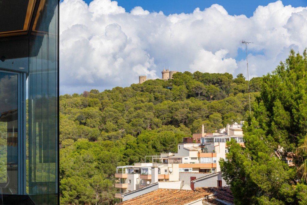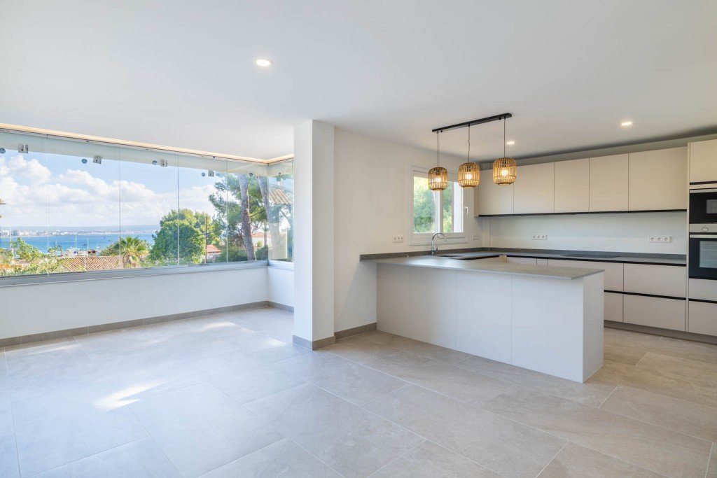 Es gibt auch einen hellen, offenen Wohn- und Essbereich und eine moderne Küche mit integrierten Geräten, von wo aus Sie einen beeindruckenden Blick auf die Bucht von Palma genießen können.