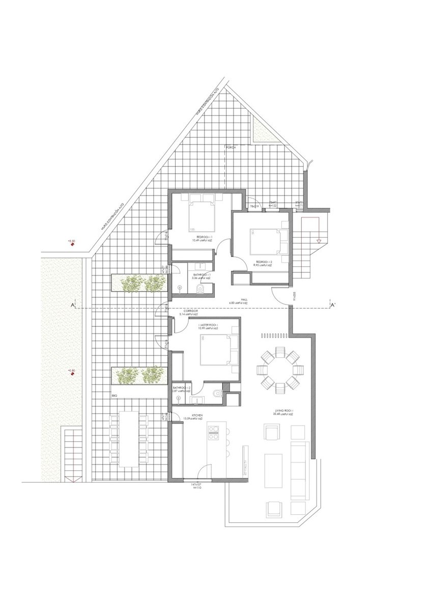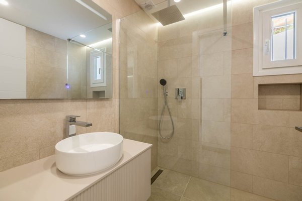 Im Inneren befinden sich drei Doppelschlafzimmer und zwei Badezimmer (eines davon en suite). Jedes der Schlafzimmer hat Zugang zur Terrasse.