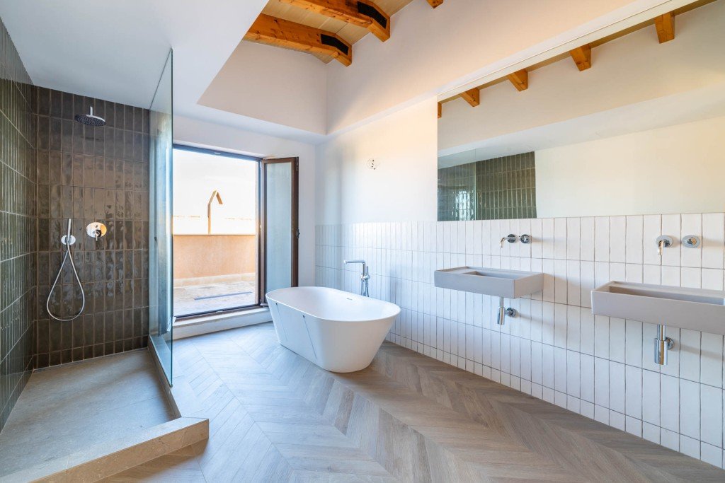 Im ersten Stock befindet sich die fabelhafte Mastersuite mit einem Ankleidezimmer, einem luxuriösen Bad mit Badewanne und direktem Zugang zu zwei privaten Terrassen, die einen herrlichen Blick auf die umliegende Landschaft bieten.