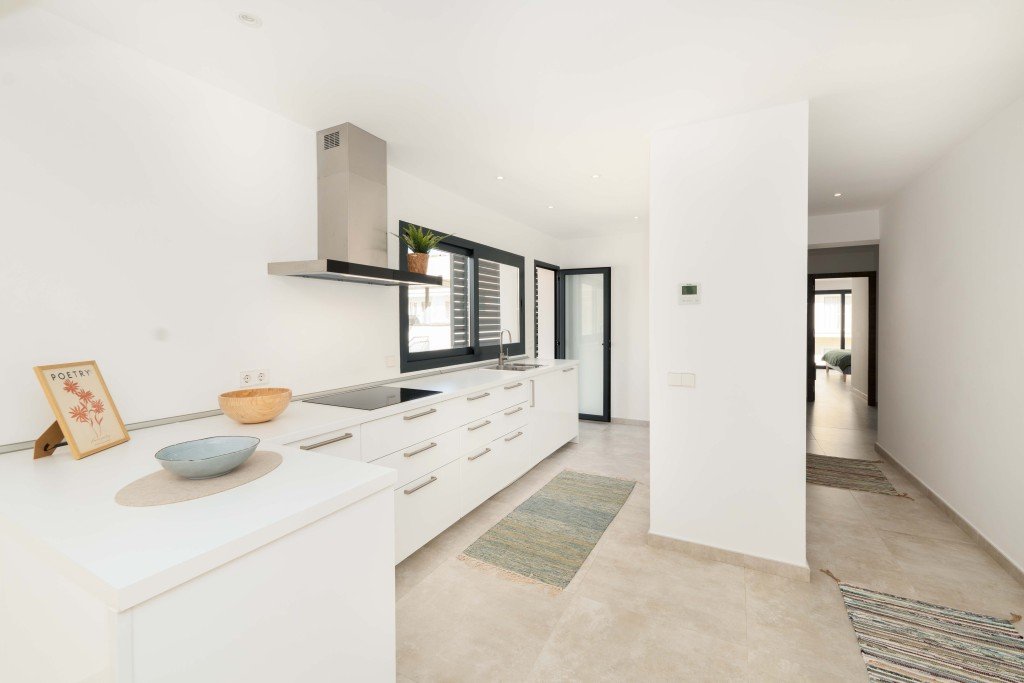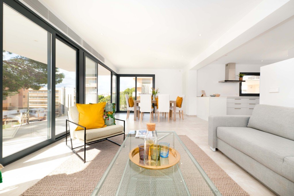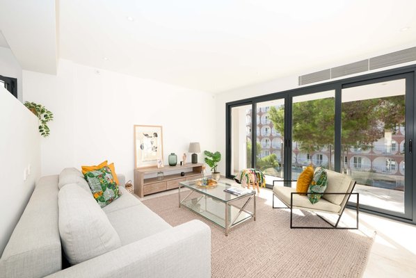 Alle Wohneinheiten bestechen durch großzügige, lichtdurchflutete Wohn- und Essbereiche, die nahtlos in eine offene, modern ausgestattete Küche übergehen. Jede Wohnung verfügt zudem über zwei stilvolle Schlafzimmer und zwei moderne Bäder. Die Balkone, die zu den Wohnungen gehören, laden dazu ein, das mediterrane Klima in vollen Zügen zu genießen.
