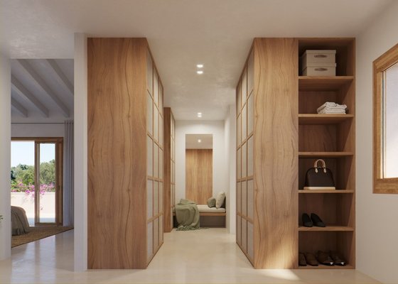 Im Obergeschoss befindet sich ein großzügiges Hauptschlafzimmer mit Ankleideraum, eigenem Bad und einer großen Terrasse mit herrlichem Meerblick. Außerdem gibt es ein Doppelzimmer mit eigenem Bad sowie zwei geräumige Einzelzimmer, die sich ein komplettes Badezimmer teilen.