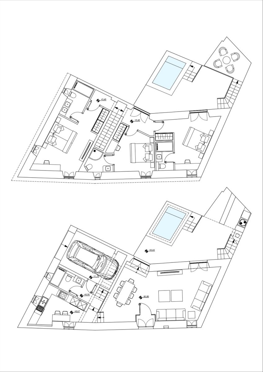 Das Haus liegt in einer ruhigen Wohnstraße und im Erdgeschoss finden Sie einen kleinen Eingangsbereich mit Glastüren, die für eine gute Isolierung sorgen. Dieser führt in das geschmackvoll gestaltete Wohn- und Esszimmer mit direktem Zugang zum Garten im Innenhof mit Tauchbecken und erhöhter Terrasse. Auf dieser Ebene befinden sich auch eine attraktive moderne Küche mit integrierten Geräten, eine Gästetoilette und eine Garage, die intern mit dem Haus verbunden ist.