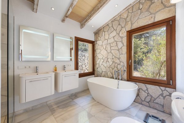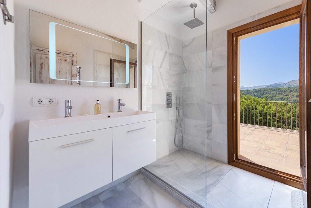 Die Villa bietet eine Eingangshalle, eine moderne Einbauküche mit separatem Hauswirtschaftsraum und ein offenes Wohn-/Esszimmer mit Schiebetüren, die direkten Zugang zur überdachten Terrasse bieten. Es gibt 3 Schlafzimmer und Badezimmer (2 davon en-suite); ein Schlafzimmer im Erdgeschoss und 2 im ersten Stock, ein Arbeitszimmer/viertes Schlafzimmer und einen Fernseh-/Bürobereich auf dem Treppenabsatz im Obergeschoss. Das Hauptschlafzimmer verfügt über große Panoramafenster und eine private Terrasse mit herrlichem Blick auf Pollensa.