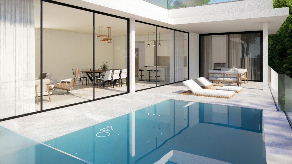 Diese außergewöhnliche Residenz mit fünf Schlafzimmern wurde unter Verwendung hochwertiger Materialien erbaut und verfügt über eine bebaute Fläche von ca. 650 m², die sich auf vier Ebenen verteilt, vom Untergeschoss bis zum Parkdeck auf dem Flachdach.