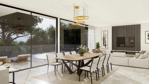 Auf der Hauptebene finden Sie ein geräumiges Wohn- und Esszimmer mit raumhohen Fenstern, eine moderne Küche, ein Gäste-WC und direkten Zugang zu einer Terrasse und dem Swimmingpool. Auf dieser Etage befindet sich auch ein Doppelzimmer mit einem begehbaren Kleiderschrank und einem eigenen Bad.