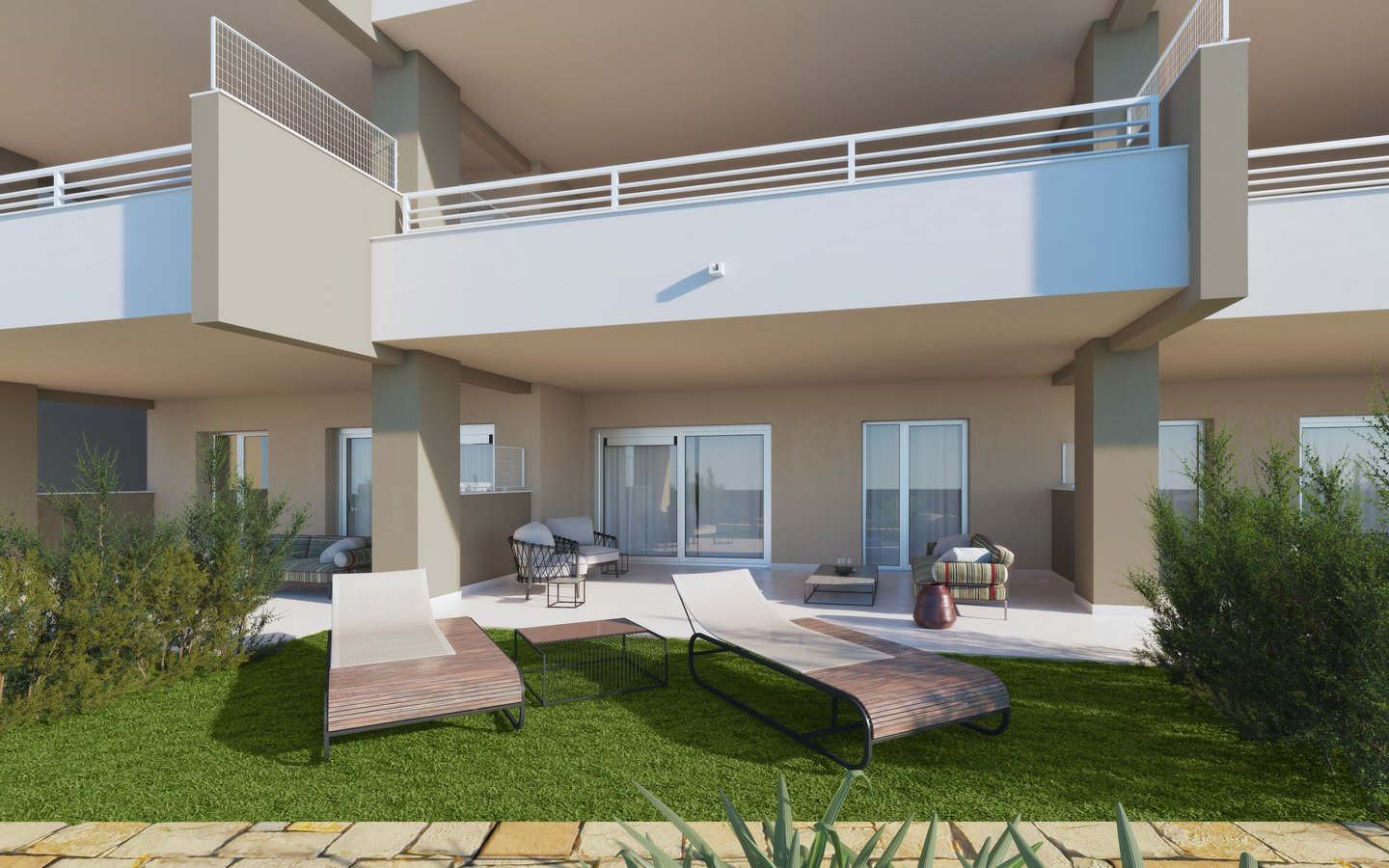 Die Anlage umfasst 69 stilvoll gestaltete Apartments mit 2 oder 3 Schlafzimmern, alle nach Süden oder Südwesten ausgerichtet. Großzügige Terrassen, helle Wohnbereiche und – je nach Einheit – Ausblicke auf Golf oder Meer schaffen ein harmonisches Wohngefühl. Hochwertige Küchen mit Balay-Geräten, modern designte Bäder, ein schöner Gemeinschaftspool, Gartenbereiche sowie ein Außenparkplatz runden das Angebot ab.