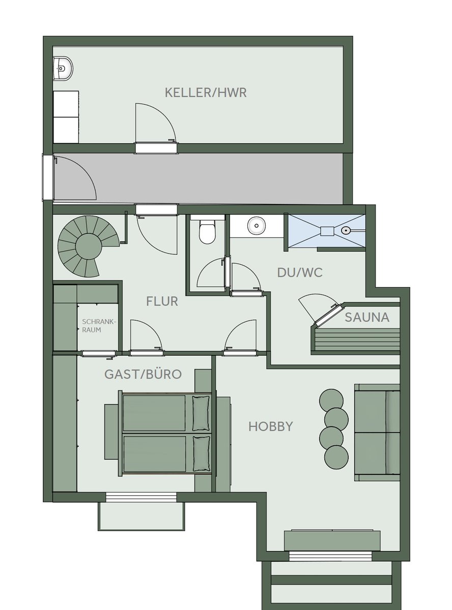 Ergänzt werden die Räumlichkeiten durch Schlaf- und Hobbyräume im Untergeschoss. Hier befindet sich auch ein kleiner Wellnessbereich mit Sauna.