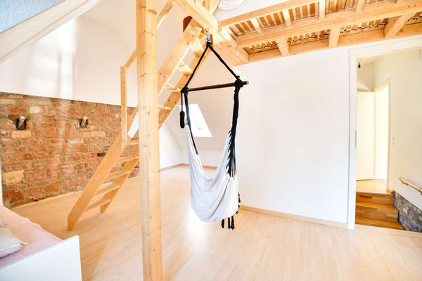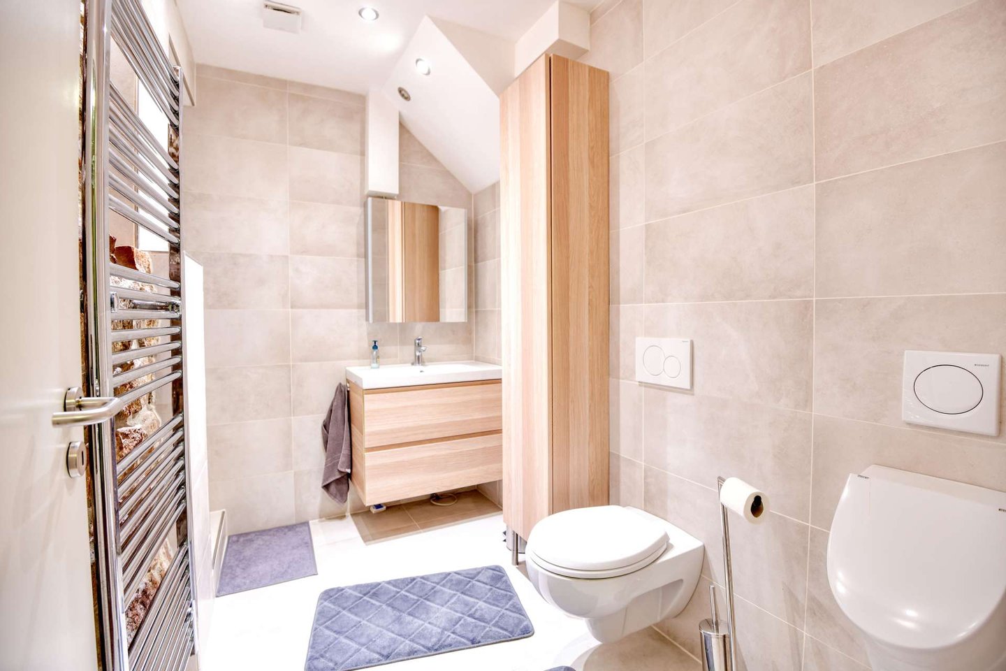 Das Mauerwerk und die Balken wurden teilweise in rustikal-modernem Stil sichtbar gelassen und als zusätzliches Extra gibt es eine Fußbodenheizung im Esszimmer. Darüber hinaus verfügt die vorgestellte Wohnung über 2 Bäder, welche Sie über den Eingangsbereich im 2.OG erreichen, gefolgt von 2 weiteren Schlafzimmern im gleichen Stockwerk. Mit der Treppe nach unten in das 1.OG erreichen Sie in der gleichen Wohnung ein weiteres Schlafzimmer plus voll ausgestattetes Badezimmer mit Dusche, WC und Urinal. Über den Flur des 1.OGs erreichen Sie über einen Fluchtweg und eine elektrisch verstellbare Treppe die Garage im EG des Hauses.