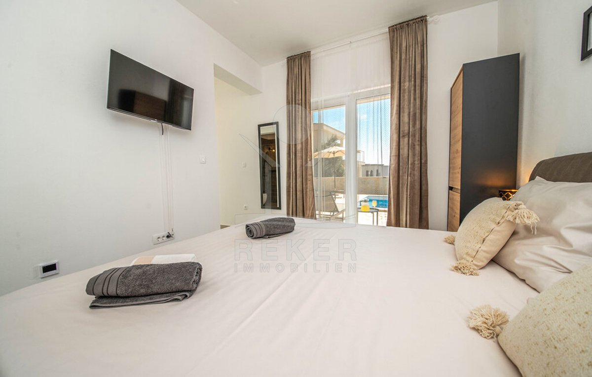 Tauchen Sie ein in das ultimative Ferienerlebnis auf der Insel Pag mit dieser stilvollen Villa in Novalja! Diese exquisite Immobilie bietet Ihnen nicht nur einen atemberaubenden Meerblick, sondern auch einen privaten Pool, der zu erholsamen Stunden unter der Sonne einlädt. Die moderne Ausstattung und der mediterrane Stil sorgen für ein komfortables Ambiente, das perfekt für Familienurlaube oder eine Investition in die Ferienvermietung geeignet ist. Hier wird Ihr Traum vom perfekten Leben am Meer wahr – genießen Sie das süße Leben in unmittelbarer Nähe des Wassers.