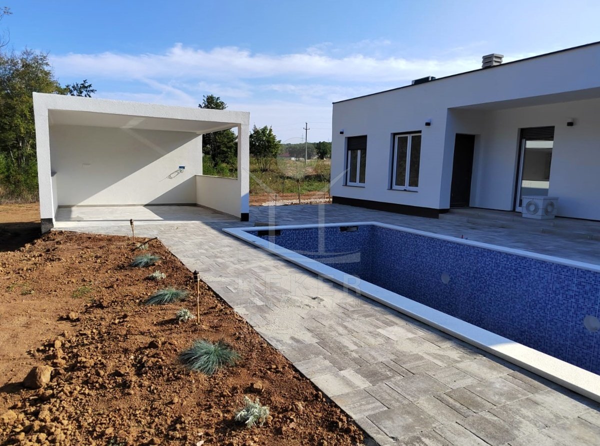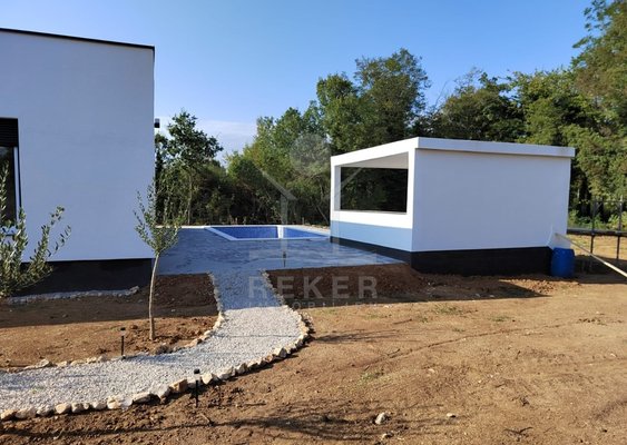 Dieser moderne Bungalow in Kršan, nahe Labin, bietet Ihnen die Möglichkeit zum Erstbezug. Der großzügige Garten und der einladende Swimmingpool machen dieses Anwesen zu einem idealen Rückzugsort für Familien und Freunde. Nutzen Sie die letzten Schritte des Neubaus und gestalten Sie Ihr Traumhaus inmitten der schönen Natur Istriens!