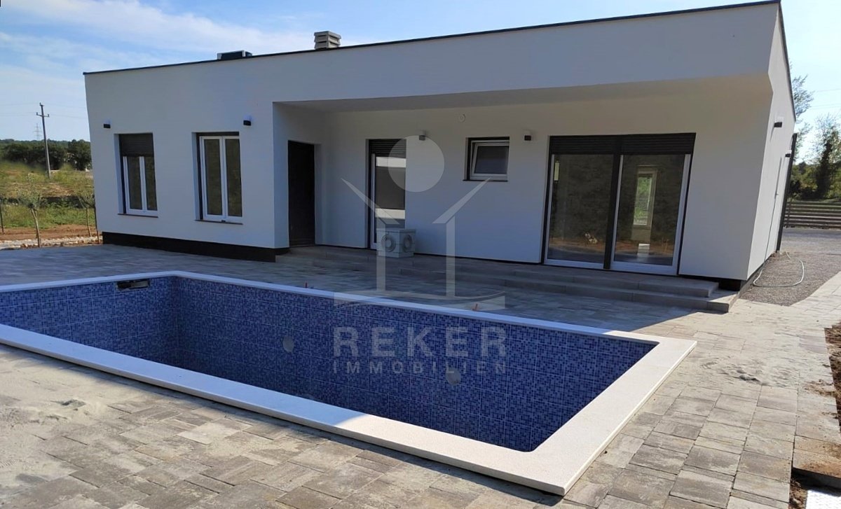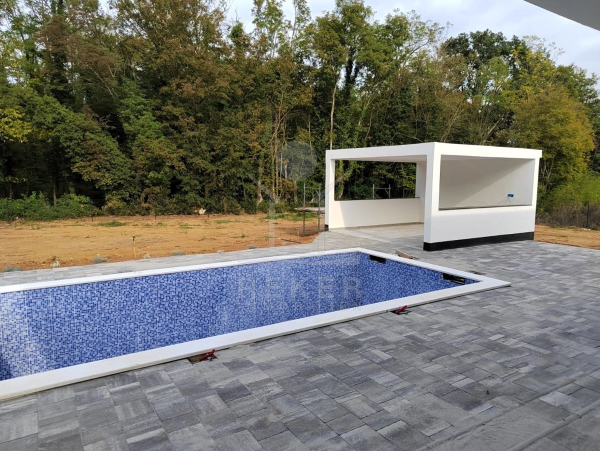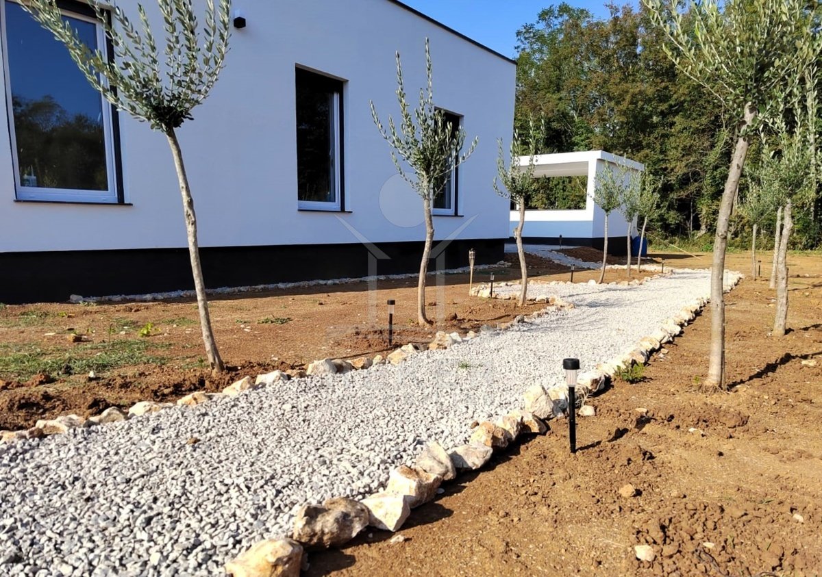 Dieser moderne Bungalow in Kršan, nahe Labin, bietet Ihnen die Möglichkeit zum Erstbezug. Der großzügige Garten und der einladende Swimmingpool machen dieses Anwesen zu einem idealen Rückzugsort für Familien und Freunde. Nutzen Sie die letzten