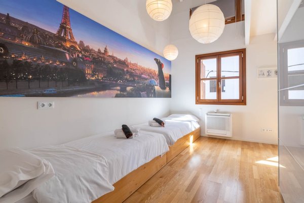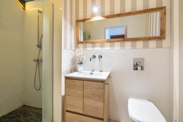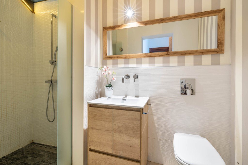 Im Erdgeschoss befinden sich ein Wohn- und Essbereich, eine offene Küche, ein Schlafzimmer mit zwei Einzelbetten und ein Einzelzimmer mit eigenem Bad.