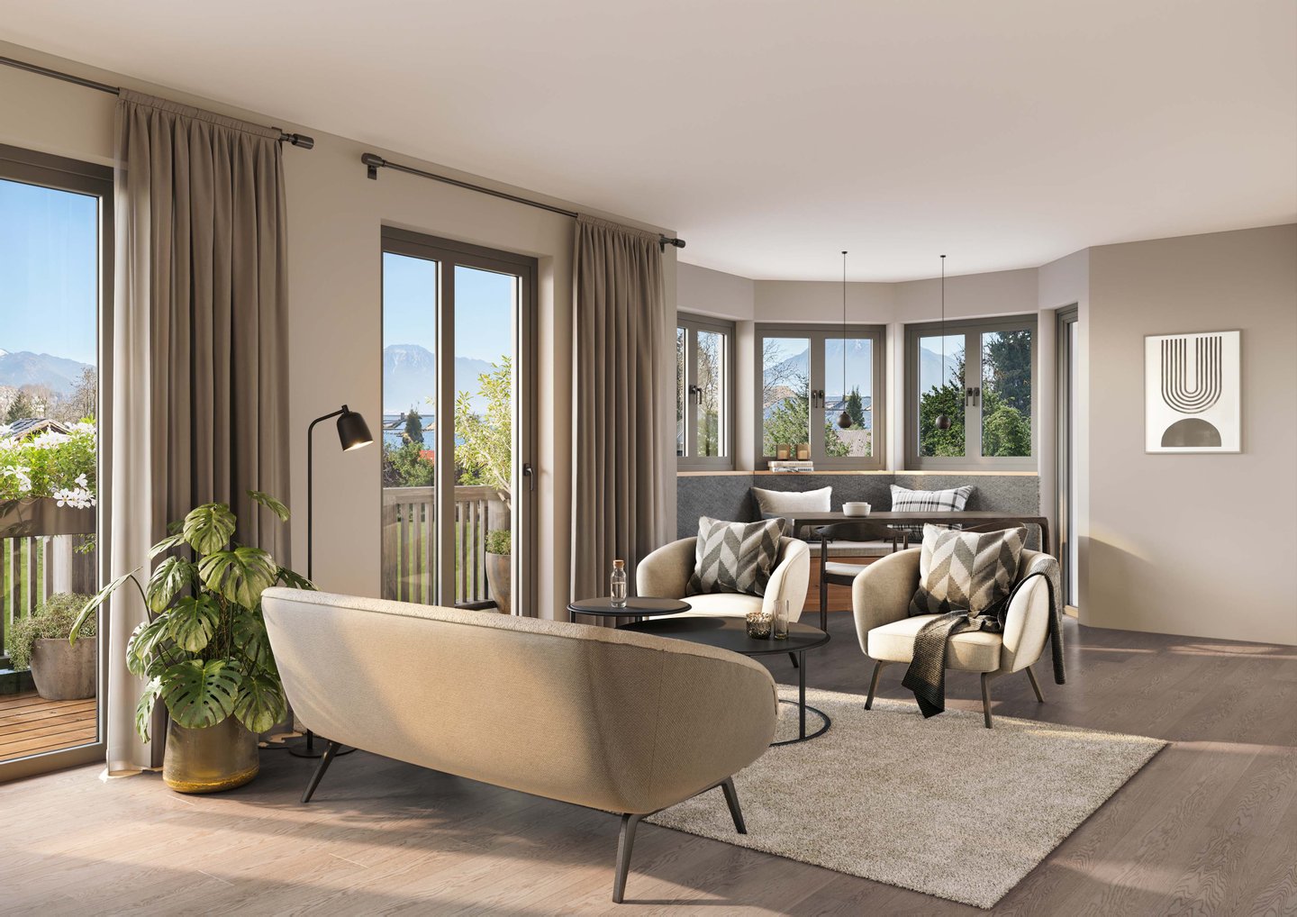 Das Wohnen auf zwei Etagen lässt die Suite nicht alltäglich erscheinen. Der Essplatz mit freiem Blick in die Natur wird harmonisch in den Erker eingebaut. Die Gartenetage verfügt über eine absolut ruhige, weitläufige Terrasse. Ein Platz, um an einem privilegierten Ort zu verweilen.