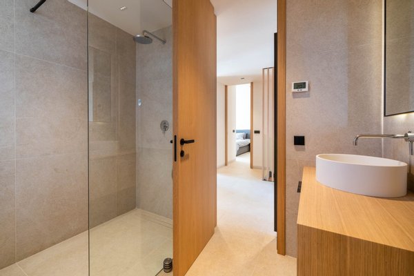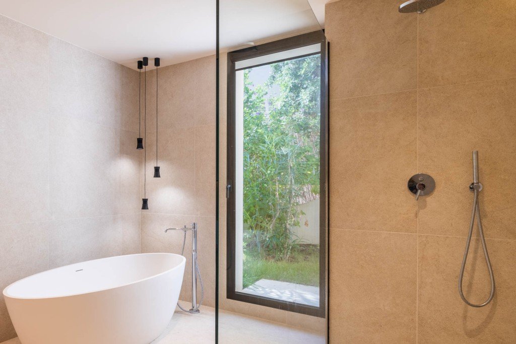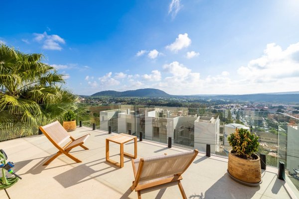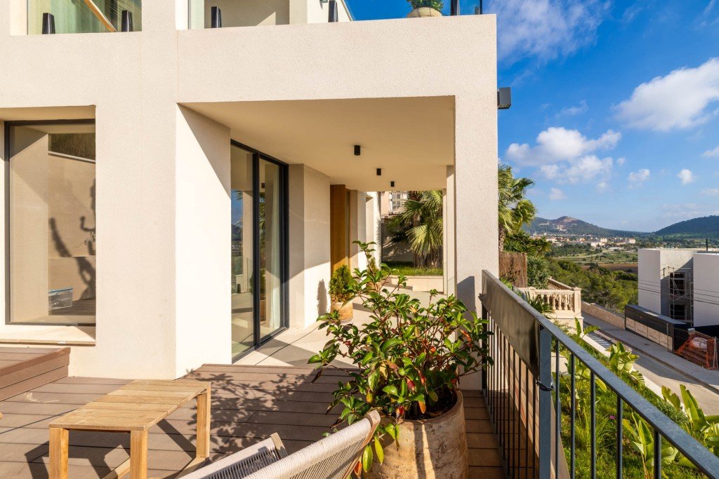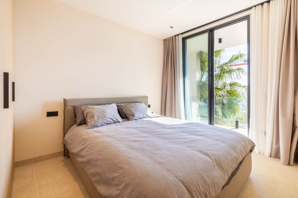 Im Obergeschoss befinden sich drei geräumige Schlafzimmer. Das Hauptschlafzimmer ist ein luxuriöses Refugium mit eigenem Bad, großen Kleiderschränken und einer 24 m² großen Terrasse mit atemberaubender Aussicht. Zwei weitere Schlafzimmer teilen sich ein Badezimmer. Eines dieser Schlafzimmer hat Zugang zu einer Terrasse und das andere einen eigenen Balkon.