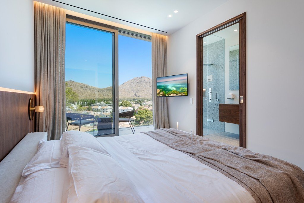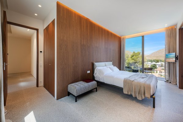 Diese erstaunliche, kürzlich fertiggestellte Luxusvilla befindet sich in erhöhter Lage in einer begehrten Gegend von Puerto Pollensa. Sie bietet einen beneidenswerten Blick auf das Tramuntana-Gebirge und ist nur wenige Gehminuten vom Strand und den