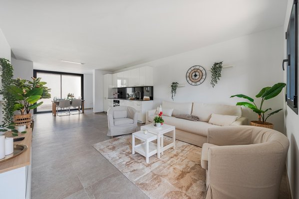 Die durchdachte Raumaufteilung umfasst drei einladende Schlafzimmer und zwei Badezimmer sowie ein zusätzliches Gäste-WC für noch mehr Komfort. Hochwertige Materialien sind überall zu finden, vom Feinsteinzeugboden bis zur voll ausgestatteten Kuchen-Küche.
