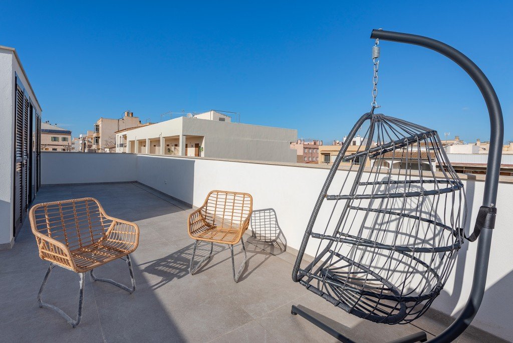 Der Außenbereich bietet einen ruhigen Rückzugsort mit einem privaten Pool und einer Dachterrasse, die sich perfekt für Momente der Entspannung eignen.