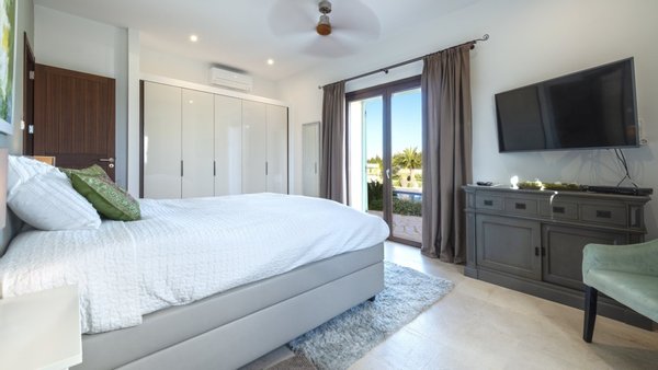 Das Hauptschlafzimmer befindet sich auf der oberen Ebene und verfügt über einen Balkon und ein Badezimmer mit Dusche und Badewanne. Jedes Schlafzimmer ist mit hochwertigen Einbauschränken, Steinwaschbecken und pflegeleichtem Bodenbelag aus Binissalem-Stein ausgestattet.