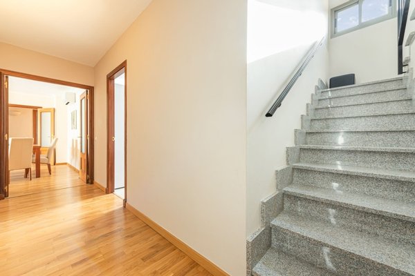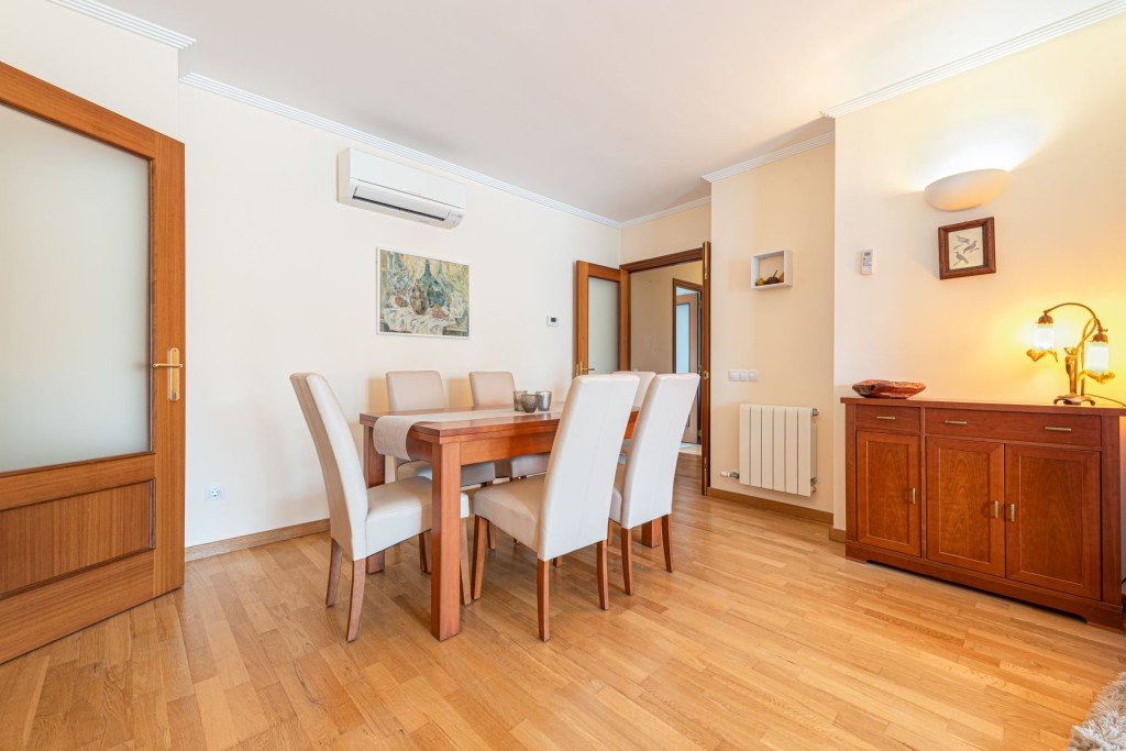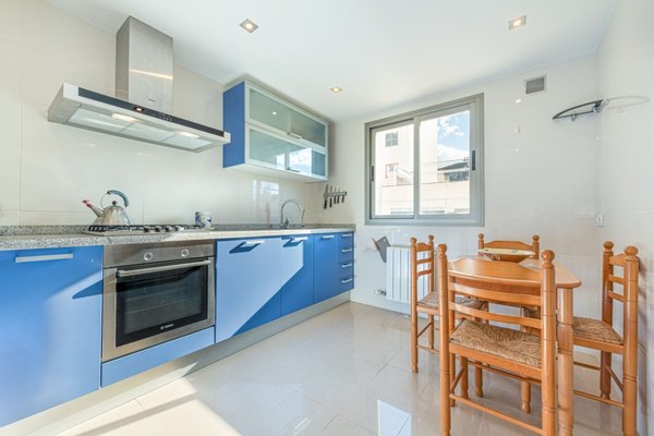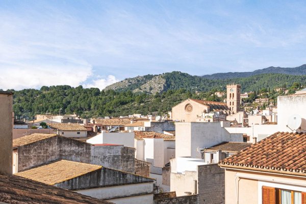Die Wohnung verfügt über eine Einbauküche mit allen notwendigen Geräten und Ausstattungen sowie eine Waschküche mit Waschmaschine. Es gibt einen schönen offenen Wohn- und Essbereich. Vom Wohnbereich aus hat man Zugang zu einem privaten Balkon mit Blick über die Dächer von Pollensa und auf den Kirchplatz und die Calvari!