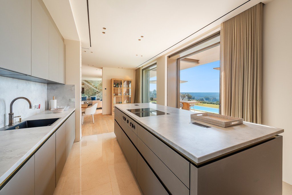 Die Immobilie verfügt über sechs Schlafzimmer mit eigenem Bad, eine moderne Küche mit integrierten Geräten und ein offenes Wohn- und Esszimmer mit einem gemütlichen Kamin. Die erhöhte Lage der Villa bietet vom Wohnzimmer aus einen herrlichen Blick auf beide Seiten.
