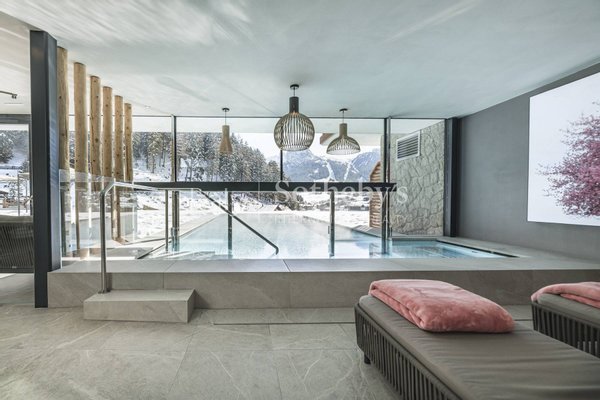 The chalet (320 m2) is made up of a spacious living area with log fire, kitchen, four comfortable suites all with en-suite bathroom, private spa area with Combi sauna, infra-red sauna, wellness shower, panoramic relax area and outdoor jacuzzi. There is an entertainment room with all round sound-system, a pool table, bar, and cinema area. The chalet also has a private ski and boot room.