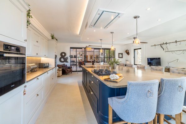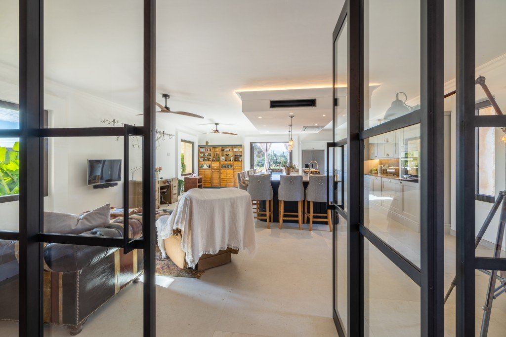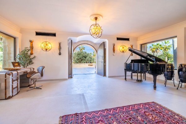 Der Haupteingang der Villa bietet einen atemberaubenden, offenen Wohnbereich mit einem Flügel und einem offenen Kamin für die Wintermonate. Es gibt eine große, voll ausgestattete Küche und ein Wohnzimmer mit einer massiven Marmorinsel, die bequem Platz für 11 Gäste bietet. Im Erdgeschoss befinden sich auch 3 Schlafzimmer, die alle mit Klimaanlage, Deckenventilatoren und Smart-Fernsehern ausgestattet sind. Alle Schlafzimmer im Erdgeschoss haben Zugang zu großen Terrassen, einschließlich der ersten Suite, die über eine private Terrasse zum Entspannen und Genießen verfügt.