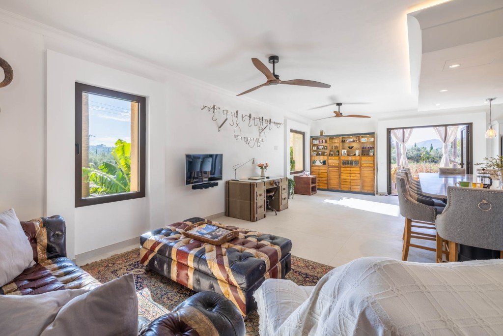 Wenn man durch das elektrische Tor auf die lange Auffahrt fährt, ist die Villa von Oliven-, Palmen- und Obstbäumen umgeben, darunter auch Bananenstauden, die Früchte tragen. Auf dem Grundstück befindet sich auch ein Weinberg, der mit einheimischen Trauben bepflanzt ist und aus dem bald Wein gekeltert wird. Die außergewöhnliche Landschaft ist vollständig eingezäunt, damit Sie sich mit kleinen Kindern nicht sorgen müssen und die so wichtige Privatsphäre gewahrt bleibt. Es gibt 3 möblierte Terrassen vor den Schlafzimmern im Erdgeschoss, die mit Sonnenliegen, Sofas, Tischen und Stühlen ausgestattet sind. Die große Terrasse am Haupteingang und der zusätzliche Essbereich im Freien neben der Küche beherbergen einen beeindruckenden hölzernen Esstisch, an dem bis zu 14 Gäste Platz finden, und eignen sich perfekt für Dinnerpartys oder sogar für die Anmietung eines Privatkochs, der auf dem großen Gasgrill kocht. Genießen Sie die Winterabende, denn die Terrasse ist mit Heizkörpern, einer Feuerstelle und einem 6-Sitzer-Warmwasser-Whirlpool ausgestattet, der nur ein paar Schritte entfernt ist. Im Frühjahr wird die Villa auch über einen Swimmingpool verfügen, um sich in den Spitzenmonaten abzukühlen.