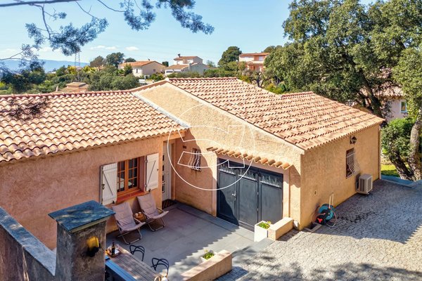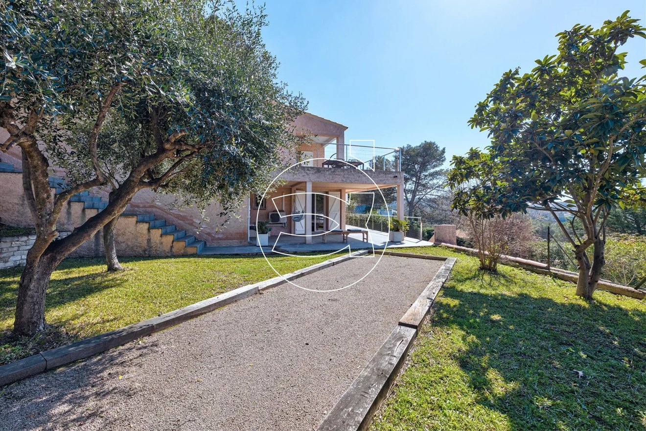 Der in Terrassen angelegte Garten umfasst einen Bouleplatz, einen Pool und mehrere Stellplätze. Ein automatisches Eingangstor sorgt für Sicherheit.