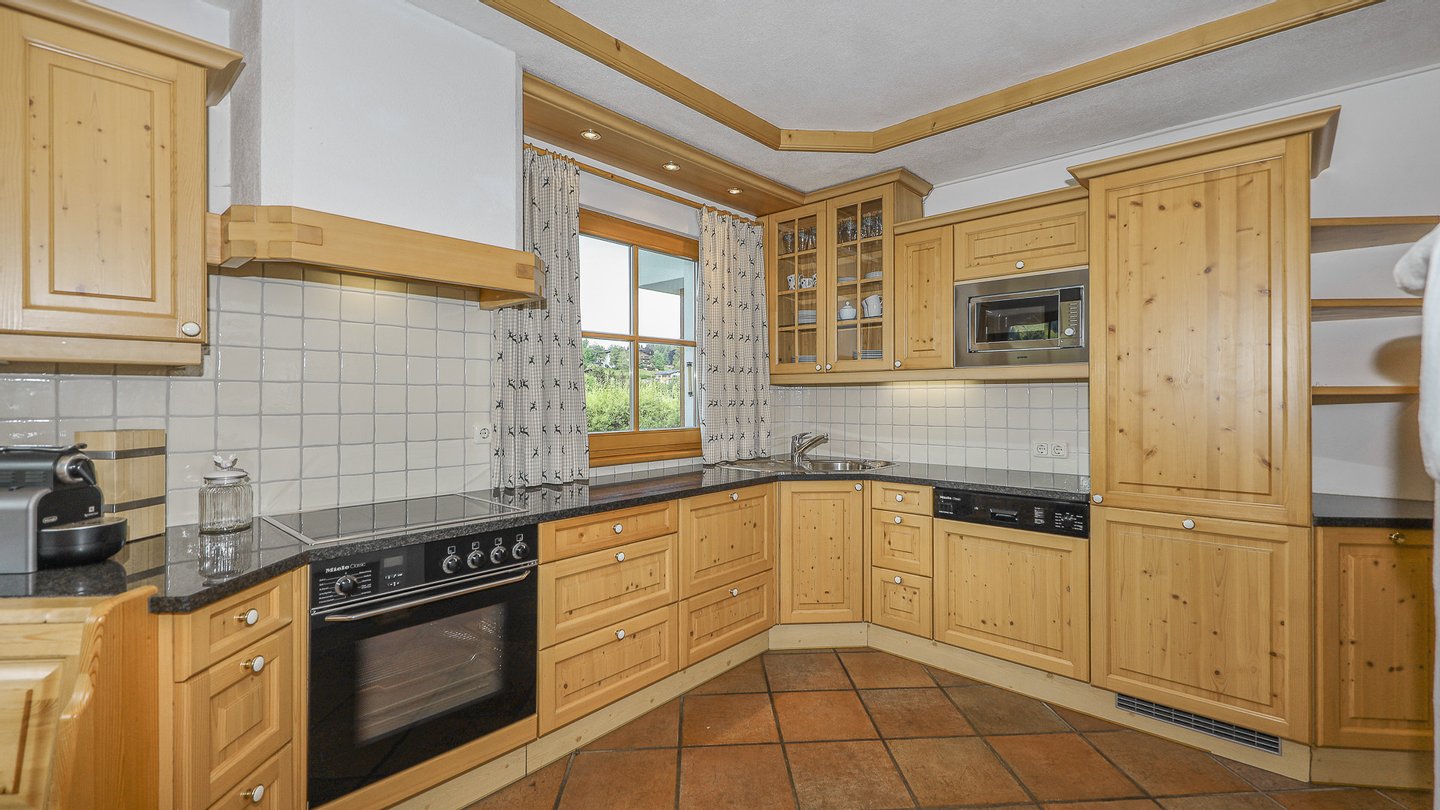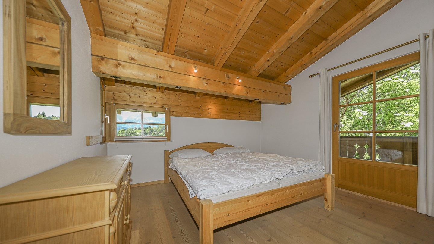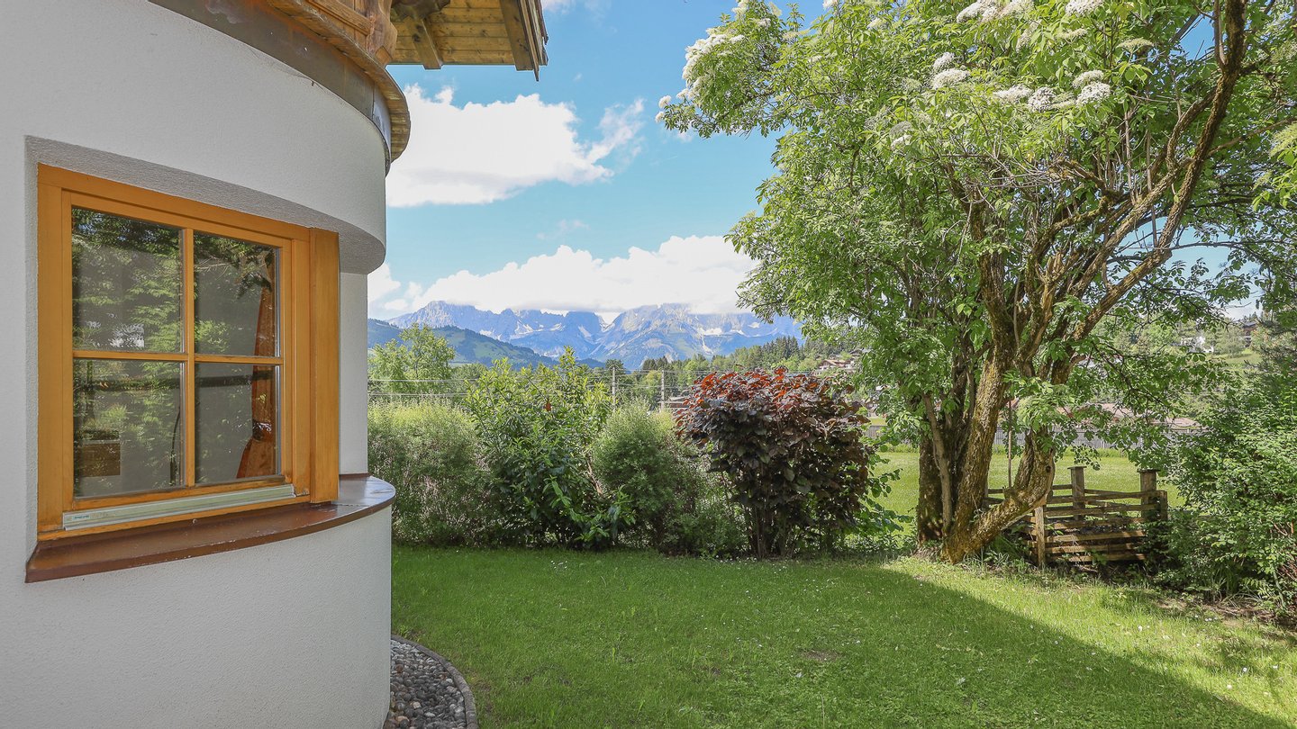 Vom Wohnzimmer gelangt man auf die Terrasse und den ca. 264 m² großen Garten, der direkt an Grünland grenzt und den Blick auf den Wilden Kaiser bietet. Weiters ist im Erdgeschoss ein Gästezimmer mit Bad ensuite untergebracht.