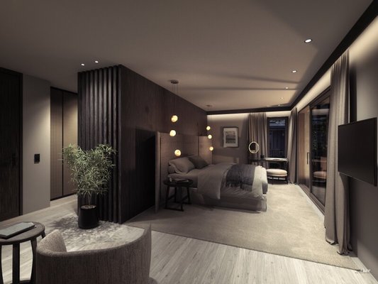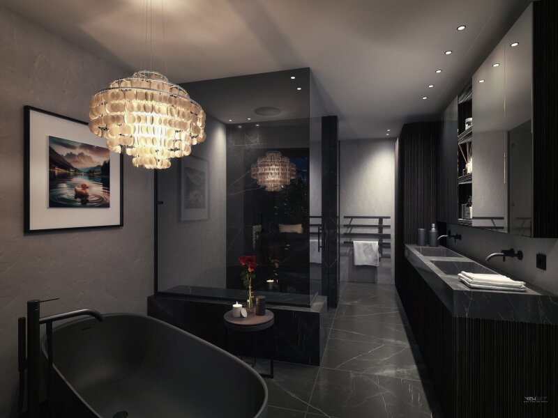 Der Projektentwickler hat für den Innenausbau und die Gestaltung bereits ein umfassendes Konzept erarbeitet, das gerne als Basis übernommen werden kann. Es bietet einen gelungenen Mix aus maßgefertigtem Handwerk mit internationalem Design u.a. mit Herstellern wie Arclinea, Gaggenau, Maxalto, B&B Italia, deCastelli, Molteni & C., Flexform, dem Lichtkonzept von FLOS, Kamin mit deCastelli Verkleidung, Holzuntersicht im Dachgeschoss mit Leisten aus gespaltener Mooreiche, Natursteinbädern, Wandbelägen aus Stoff, Leder, Tapeten, Spachtelungen.
