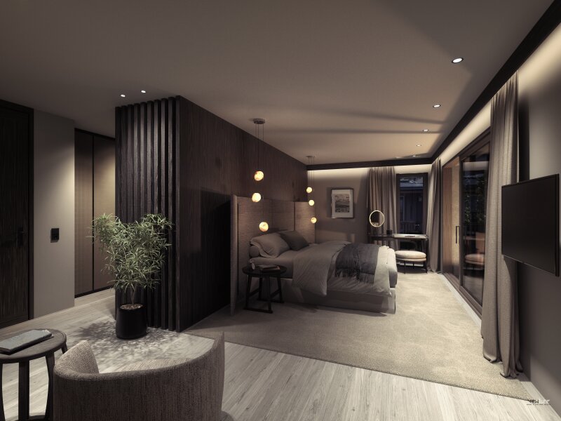 Masterbereich mit Schlafzimmer, Bad, Garderobenraum und Terrasse